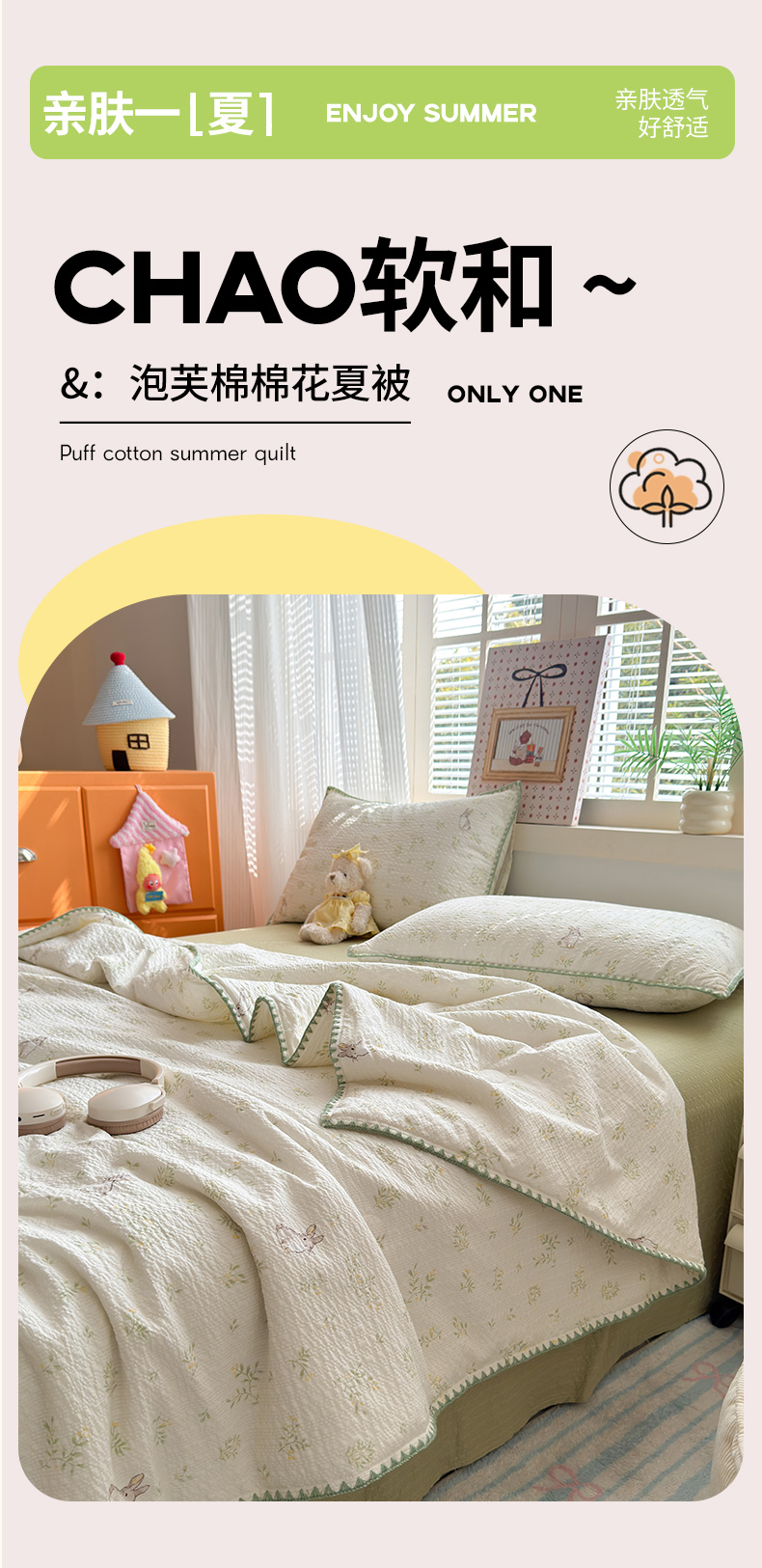 暖阳 2026新款100%棉花泡芙棉贝壳夏被被子被芯 绿野小兔
