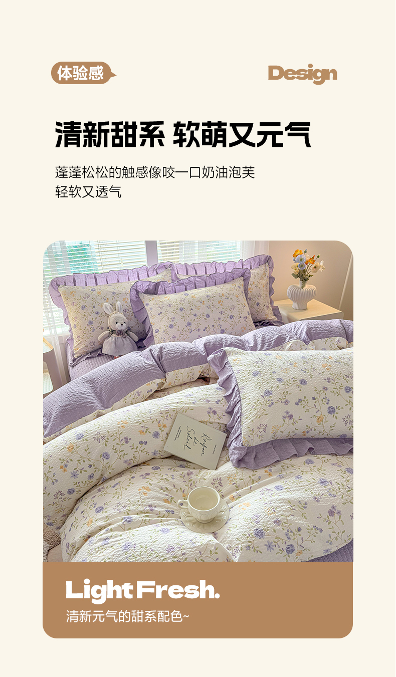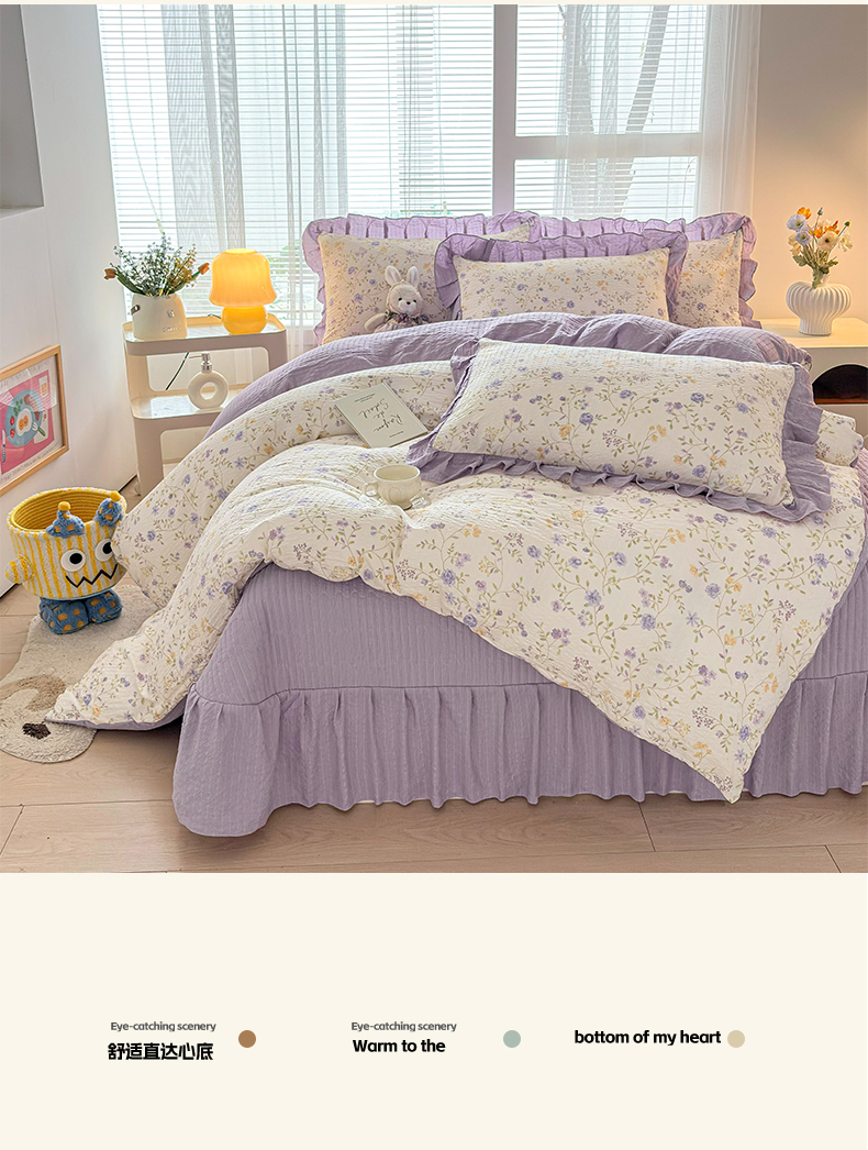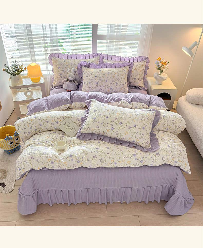 畅畅家纺 2026新款春夏小清新泡芙双层纱床盖款四件套 紫薇花开