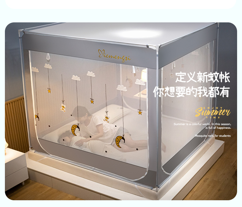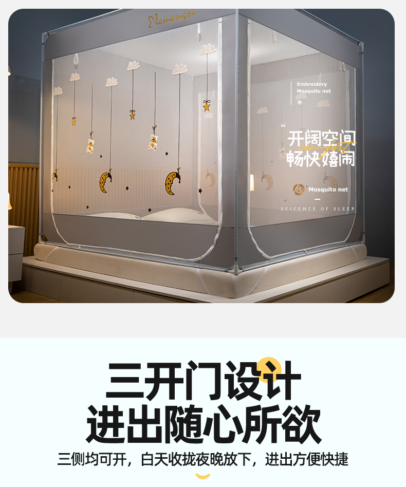 (总)飞轮海蚊帐 2023新款三开门落地遮光蚊帐-L-93,高级灰,芥末绿,奶油黄,香槟