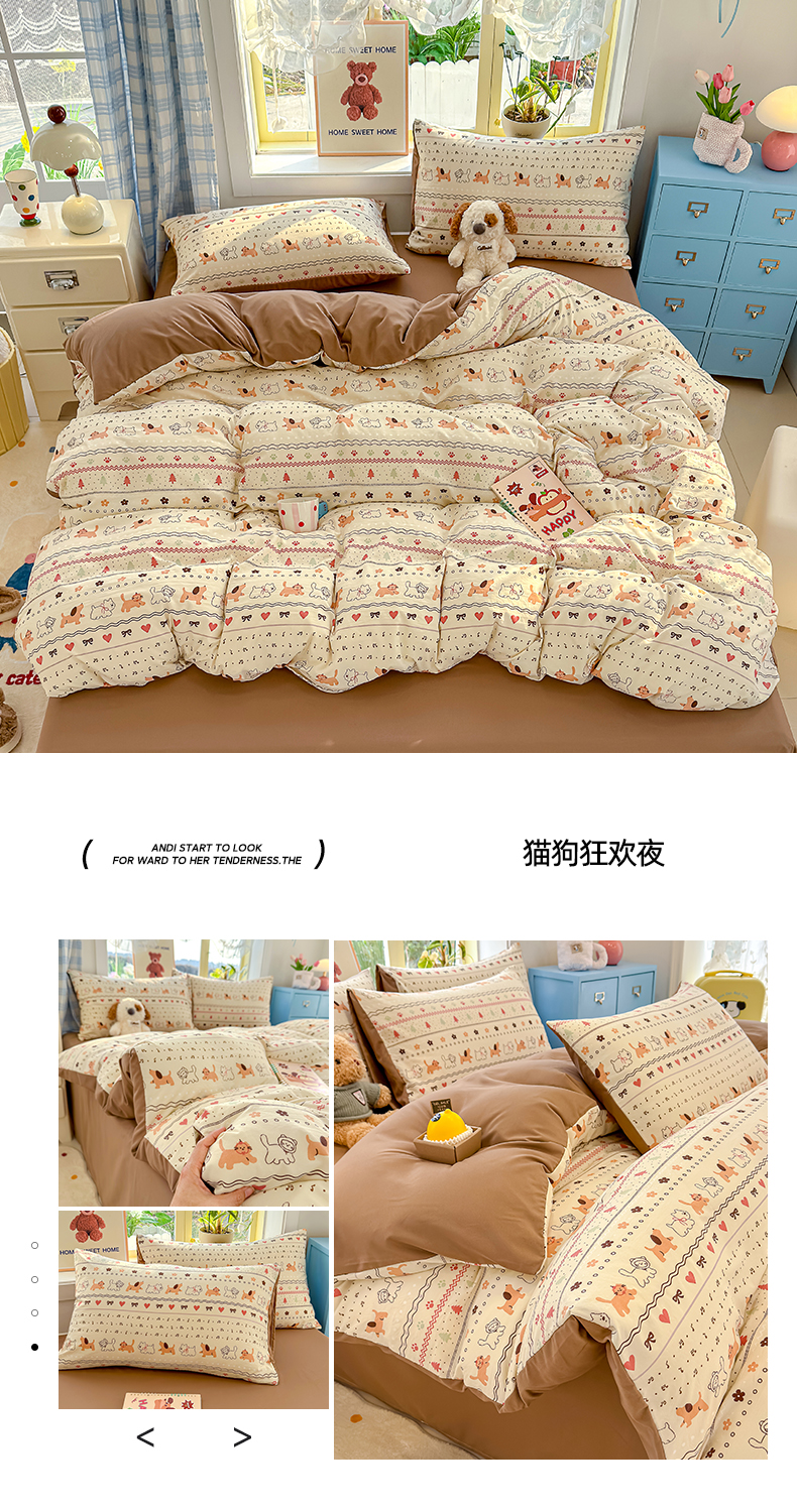 商品名称:铺尚美家纺 2026新款A类古法水洗仿棉云感纱四件套 猫狗狂欢夜