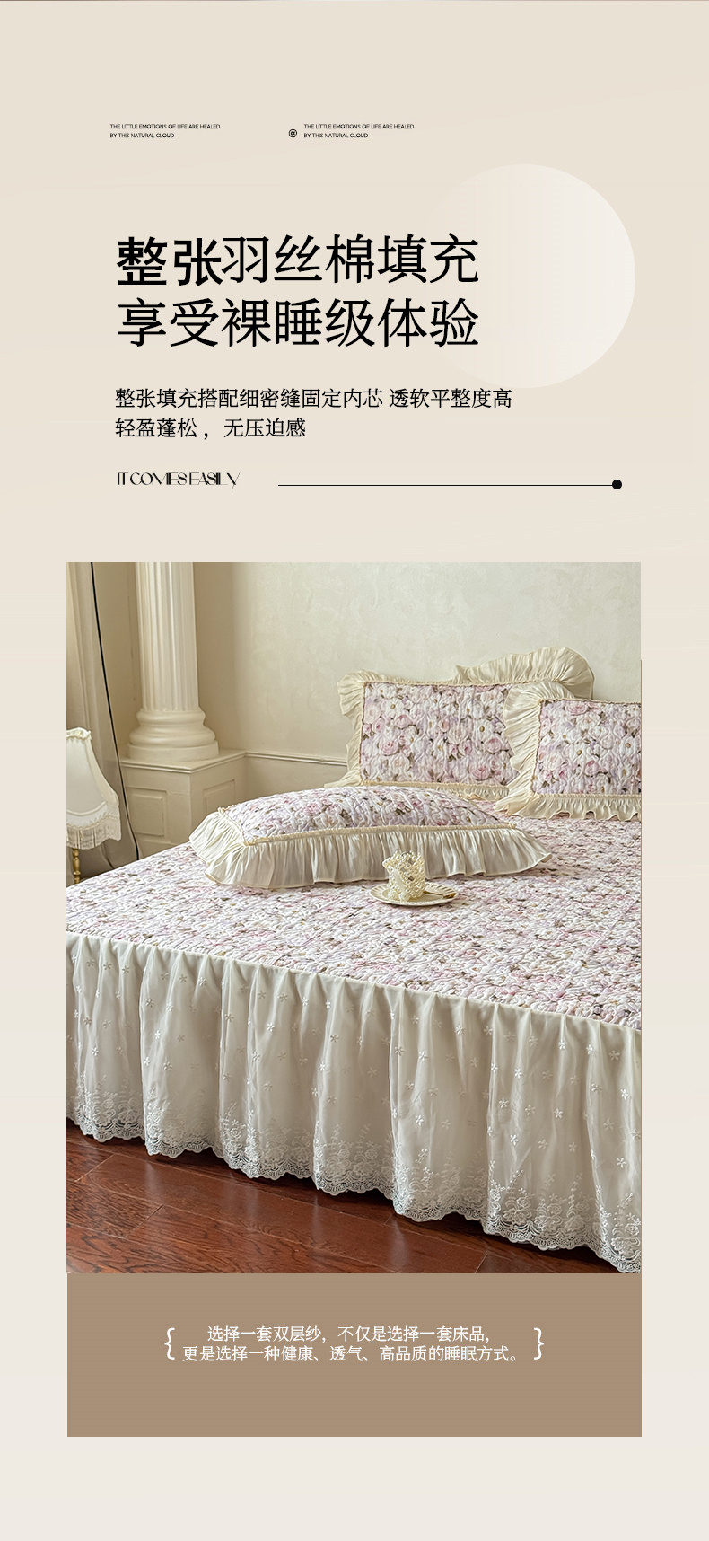 (总)花香四季家纺 2026新款法式天丝棉蕾丝雪纺仙女风夹棉床裙款四件套,赫本-粉色,赫本-米白色