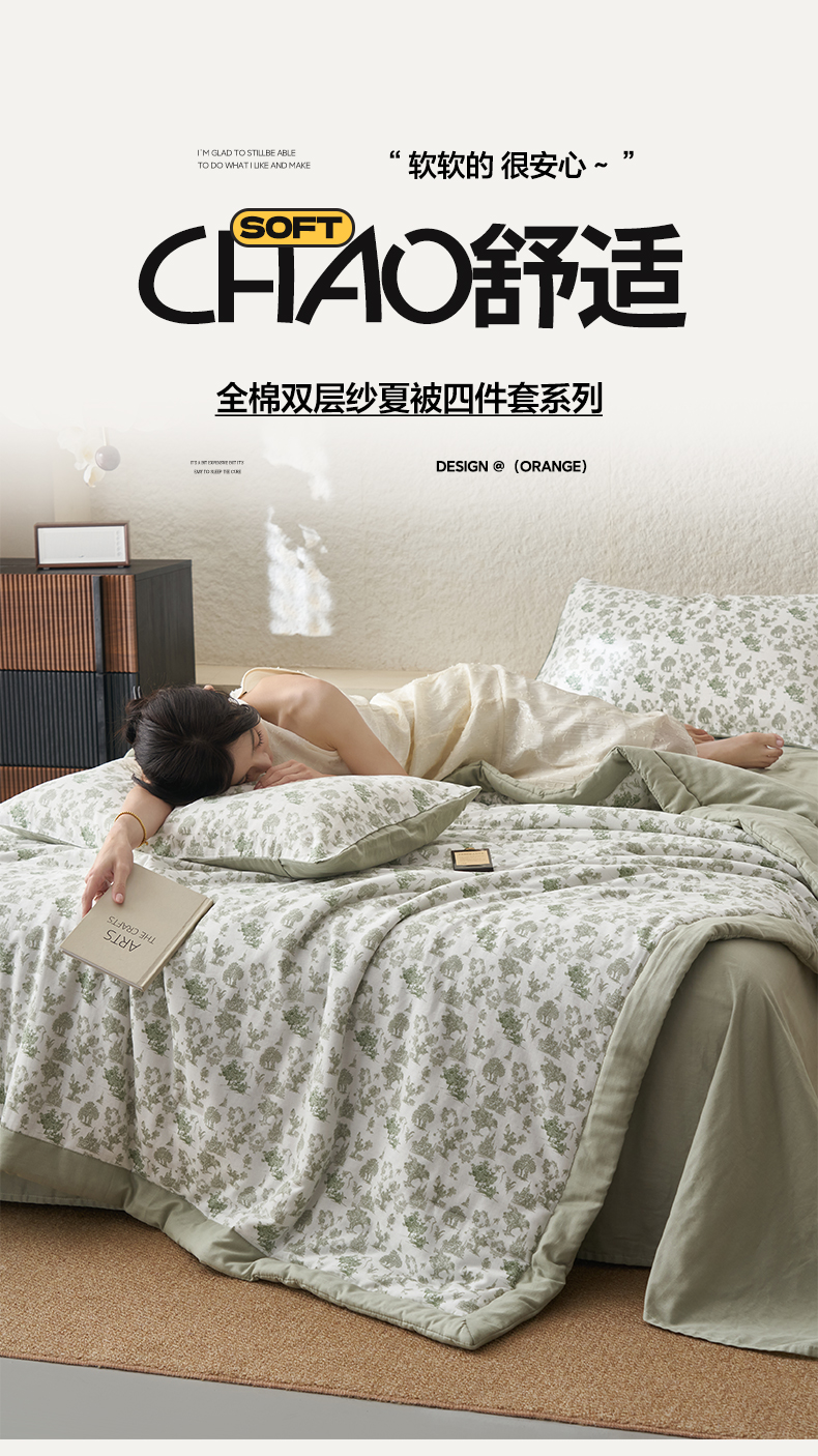 • 91家纺网 家纺一手货源 找家纺 晨曦家纺 2026新款全棉双层纱夏被四件套复古纯棉中国风夏凉被 组合图仅展示