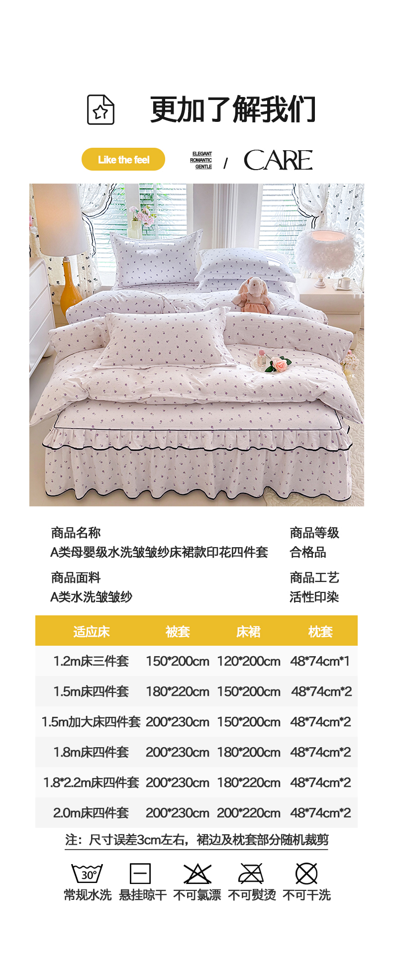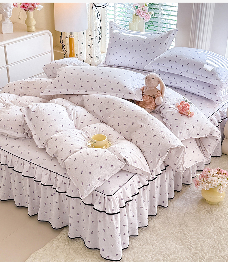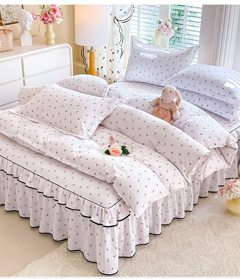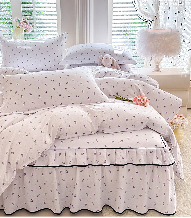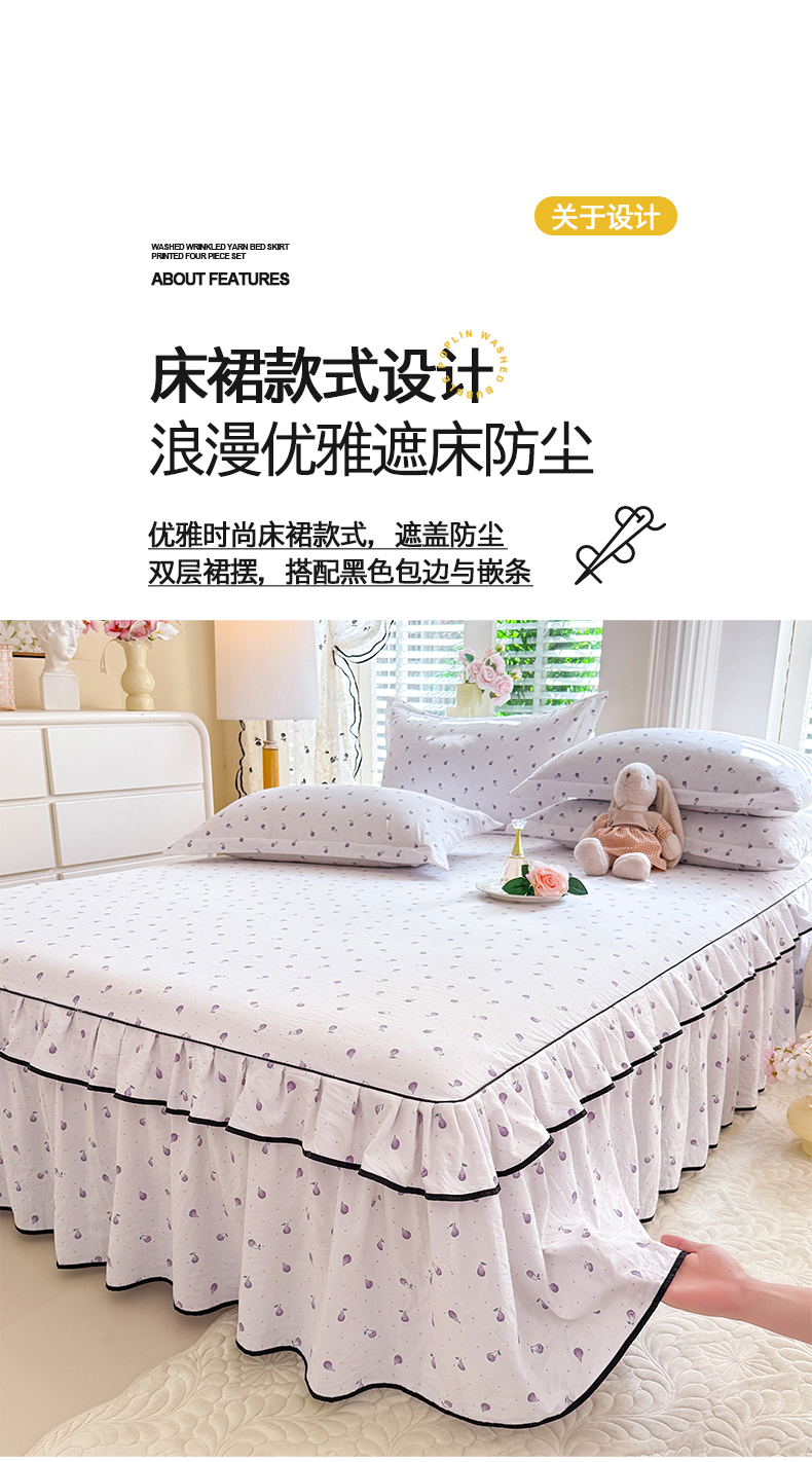 当前位置: 91家纺网 > 商品网购 > 床品套件 > 四件套 > 化纤普通四件套 > 优家居 2026新款A类水洗棉床裙四件套皱皱纱韩版公主风花边床罩直播爆款外贸定制 一口葡萄