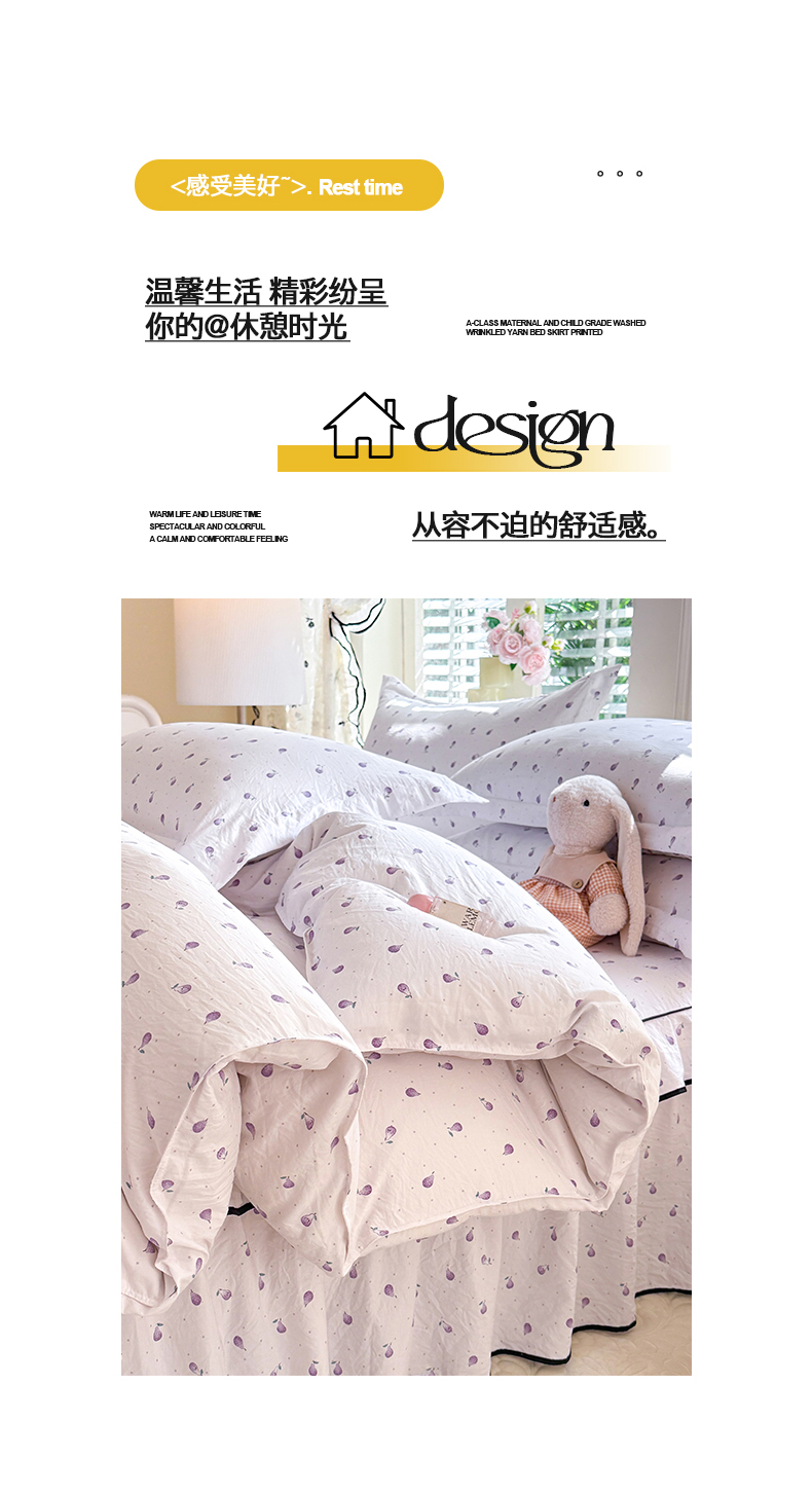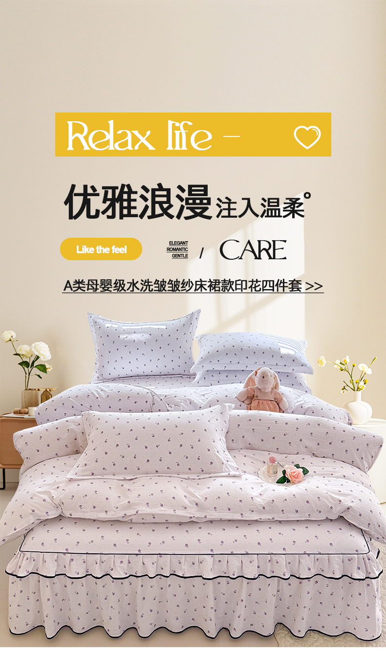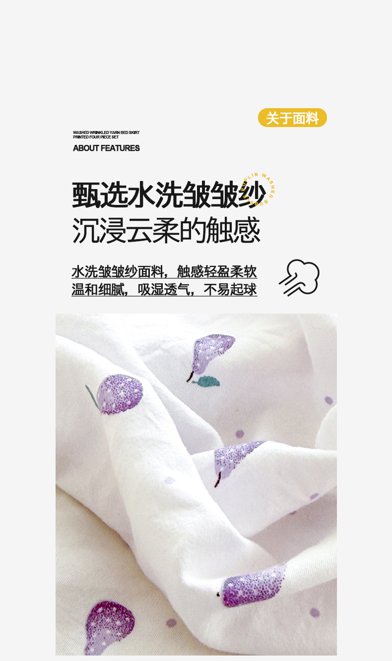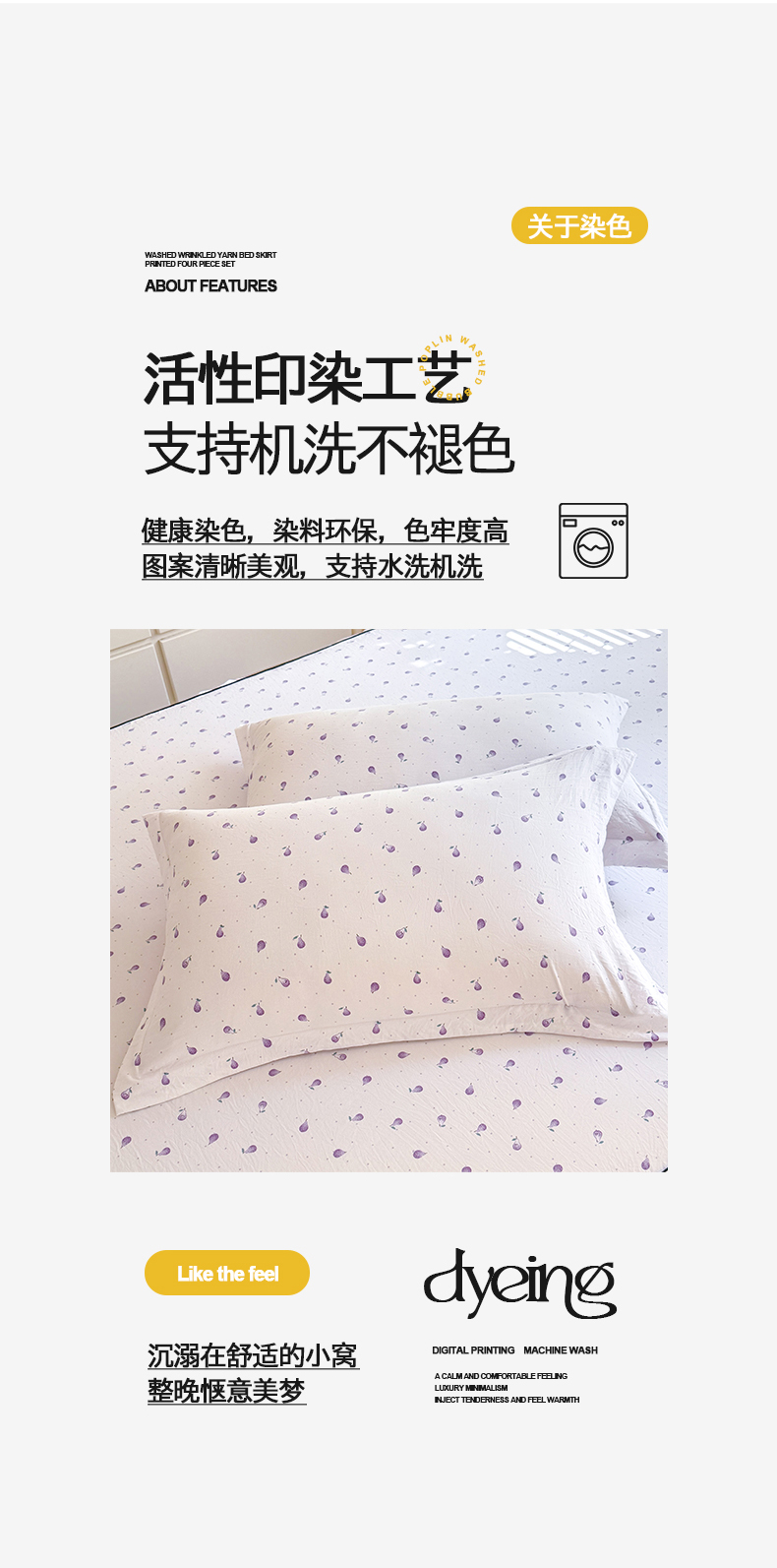 当前位置: 91家纺网 > 商品网购 > 床品套件 > 四件套 > 化纤普通四件套 > 优家居 2026新款A类水洗棉床裙四件套皱皱纱韩版公主风花边床罩直播爆款外贸定制 一口葡萄