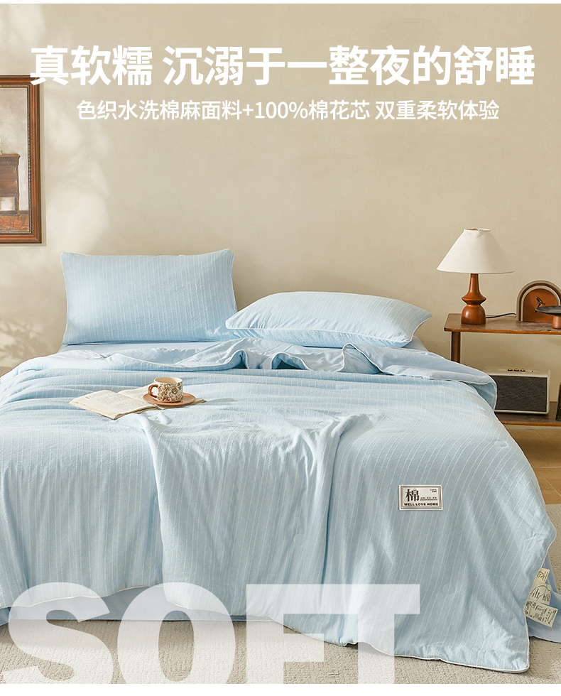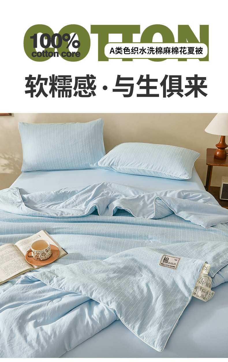 (总)晓时候 2026新款色织水洗棉麻100%新疆棉花被夏被全棉被子夏凉被空调被,静谧蓝,薄荷绿,暮色灰,奶芙黄,香妃粉,珍珠白