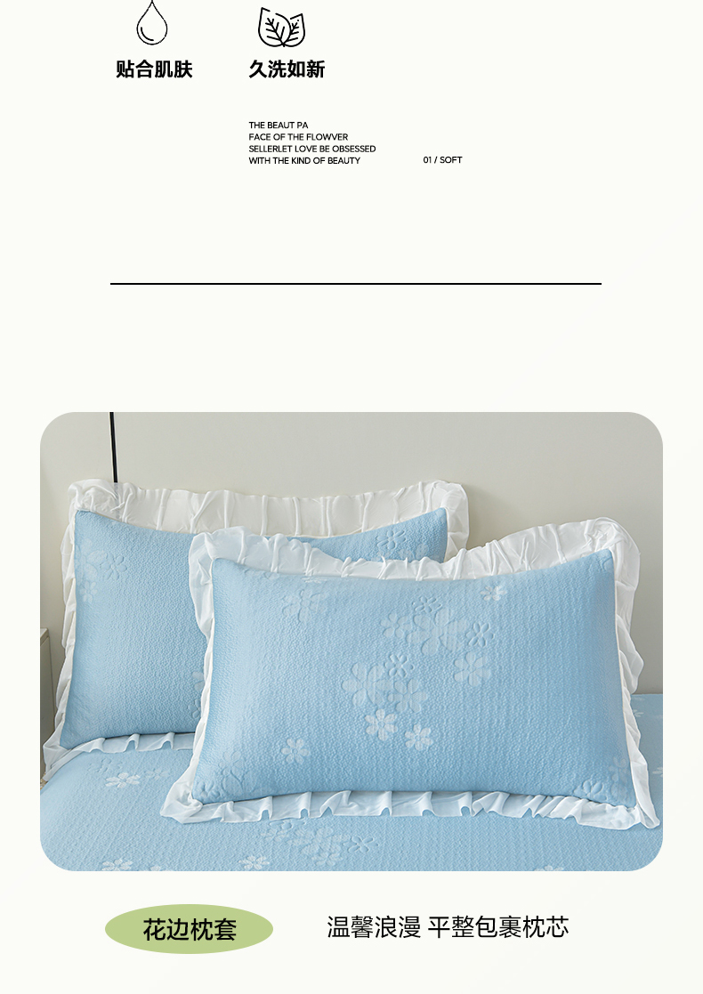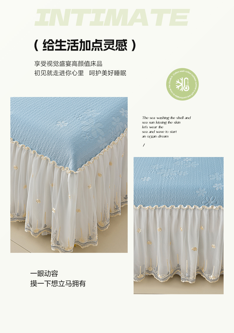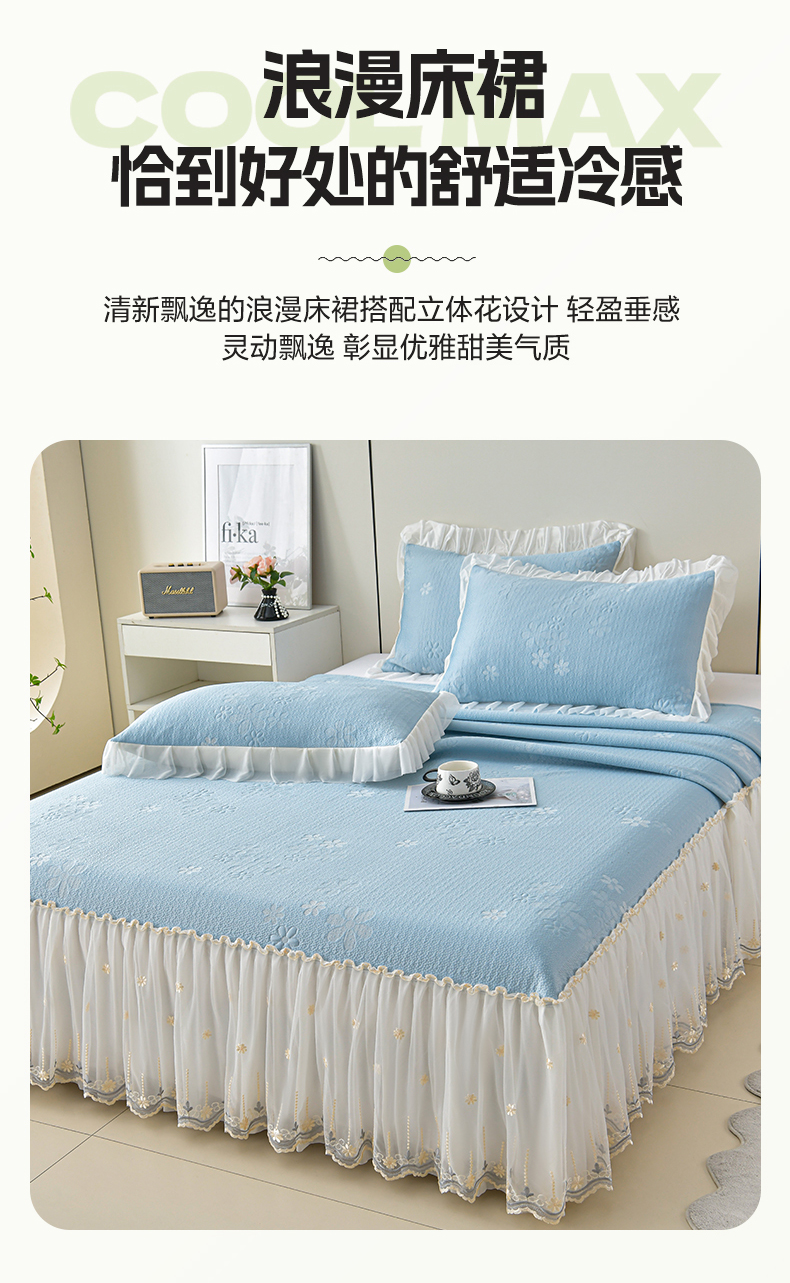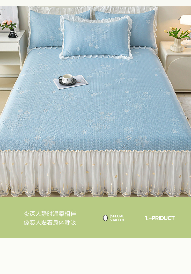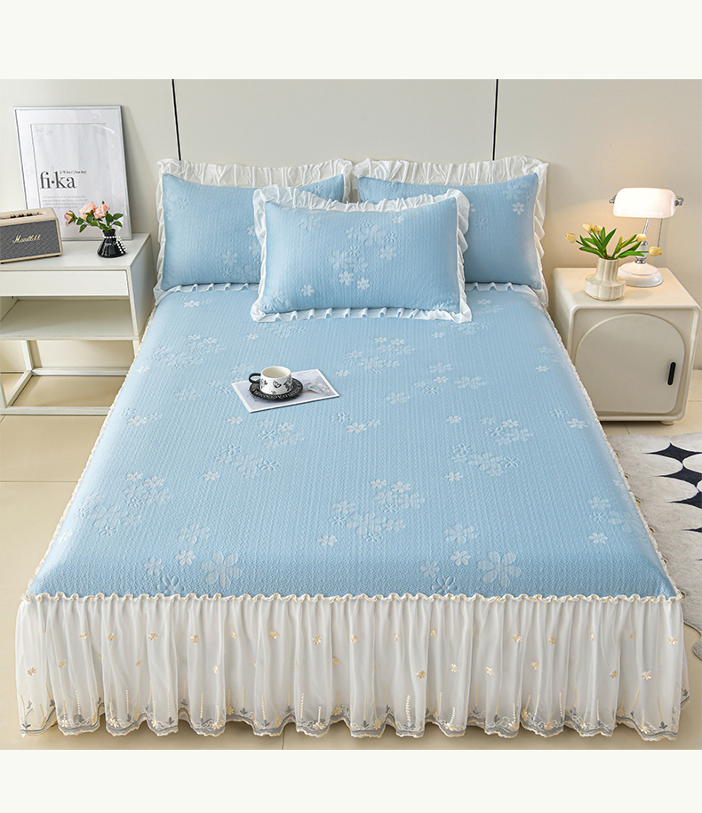 商品名称:畅畅家纺 2026新款花边3D立体冰豆豆冰丝凉席床裙款三件套 幸运花朵-蓝