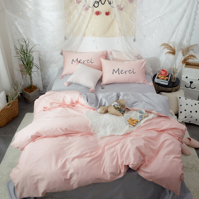 优然居家纺 60长绒棉文艺双拼撞色刺绣系列四件套粉灰