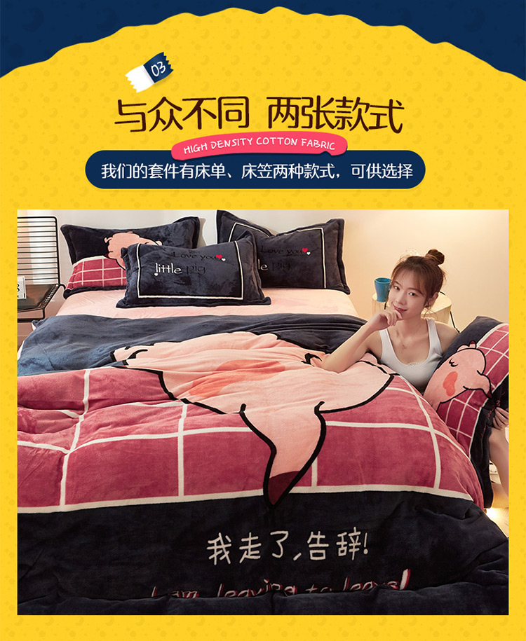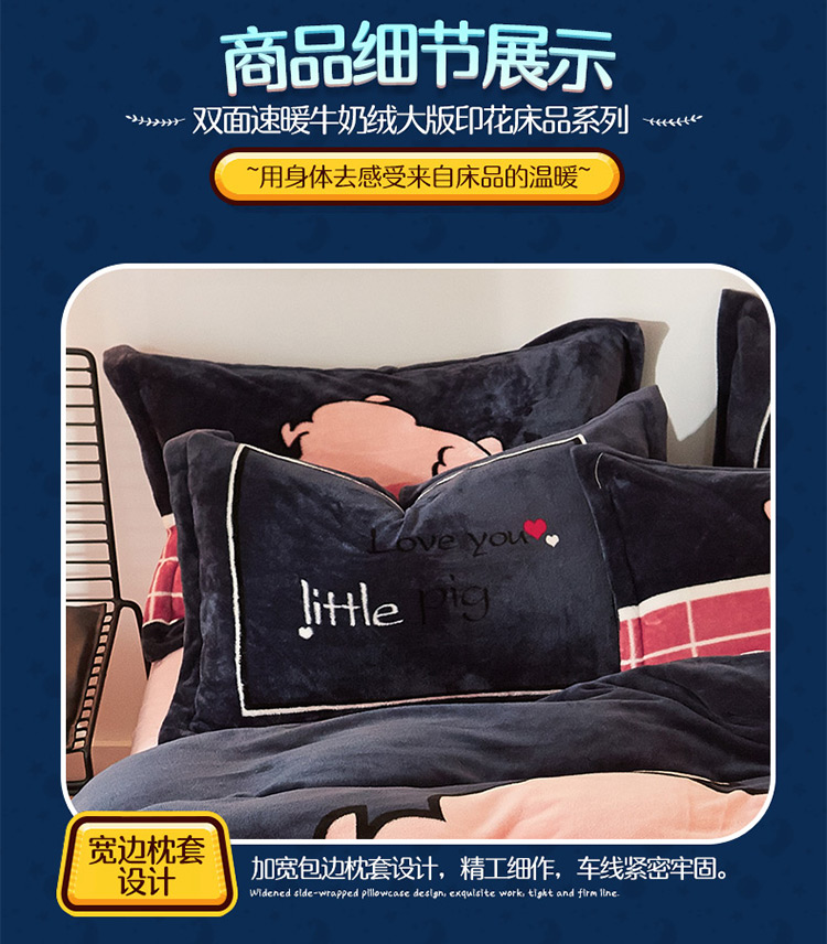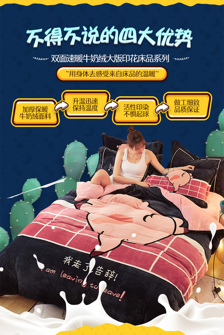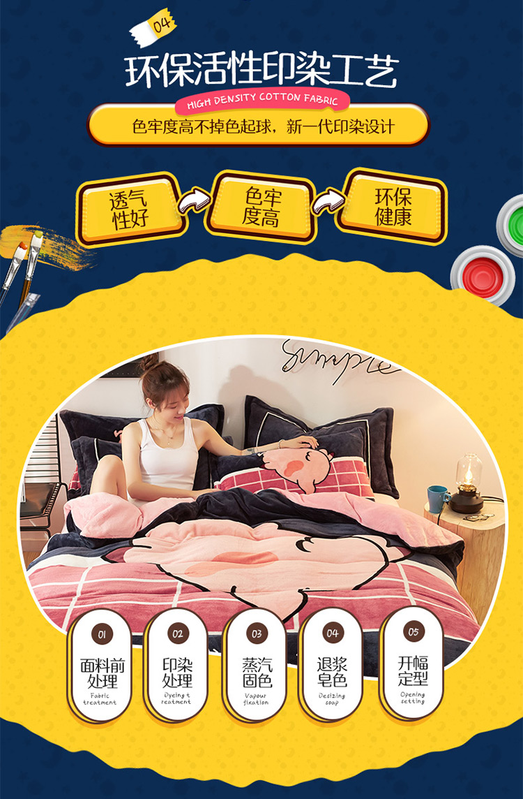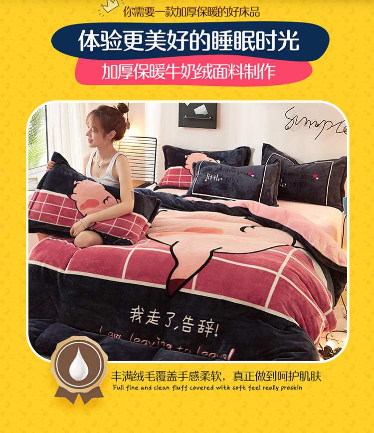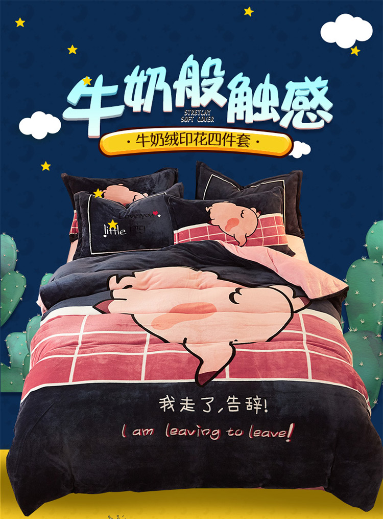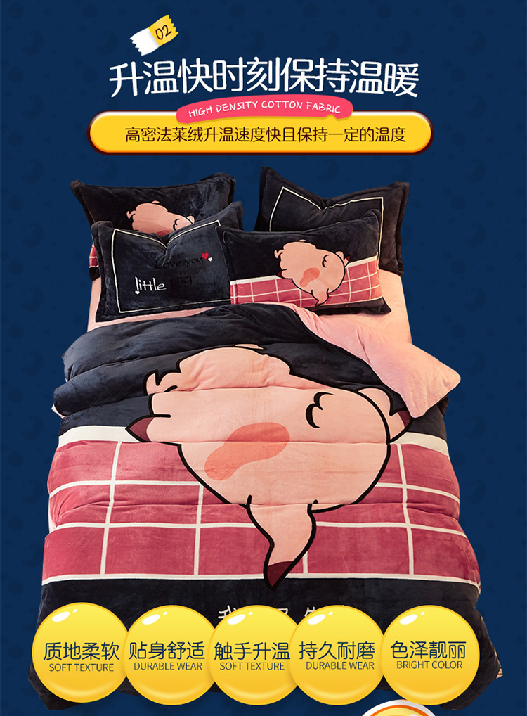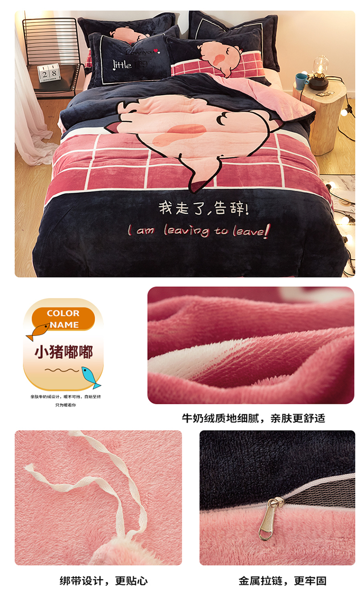 KT猫直营店2024新款卡通法莱绒牛奶绒情侣四件套 小猪嘟嘟