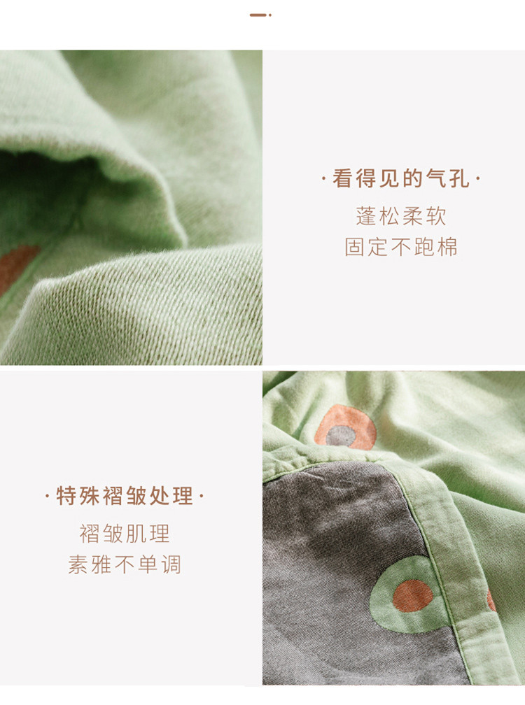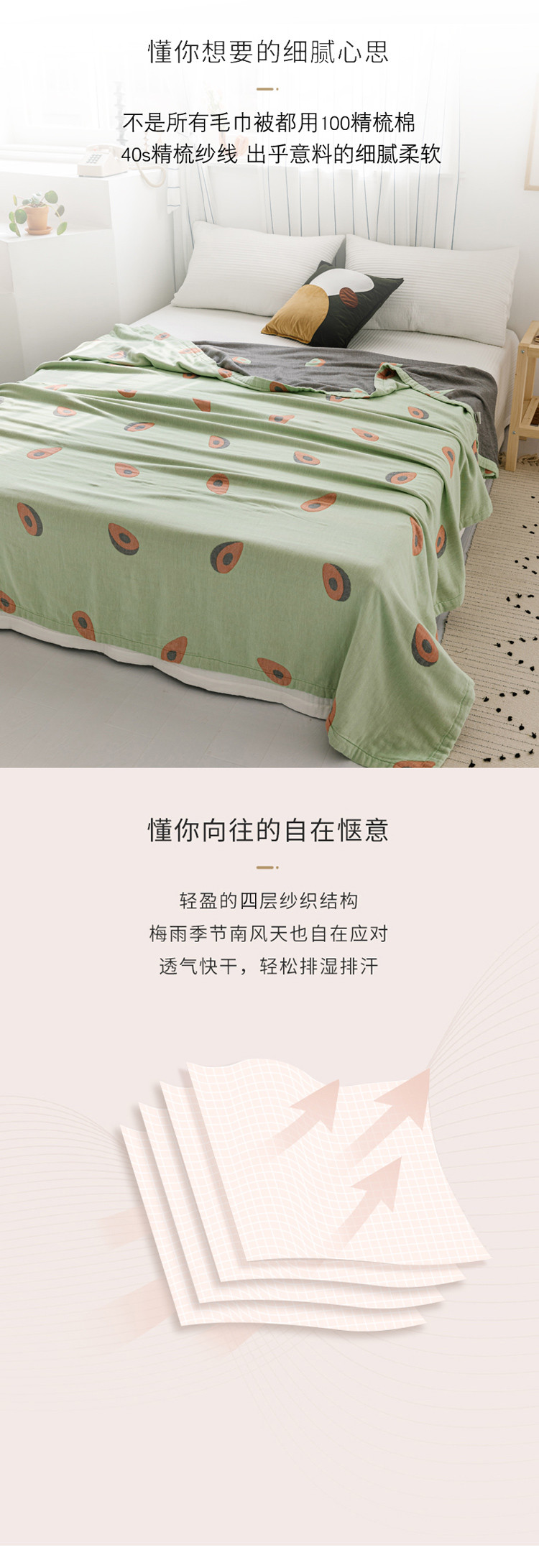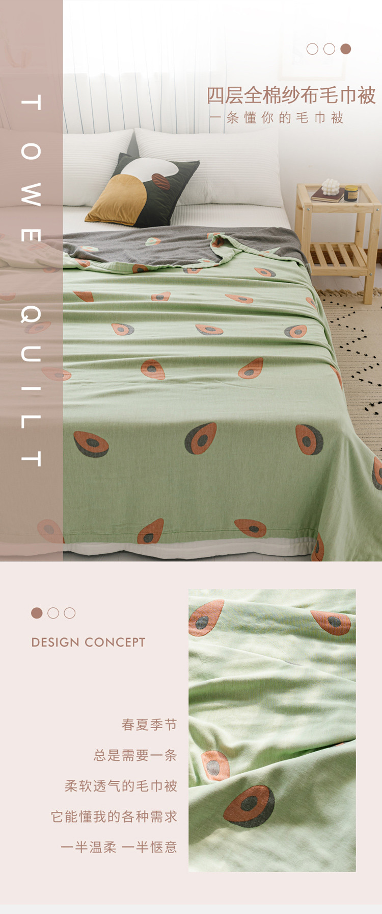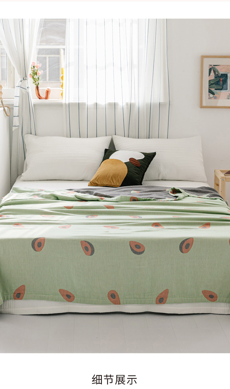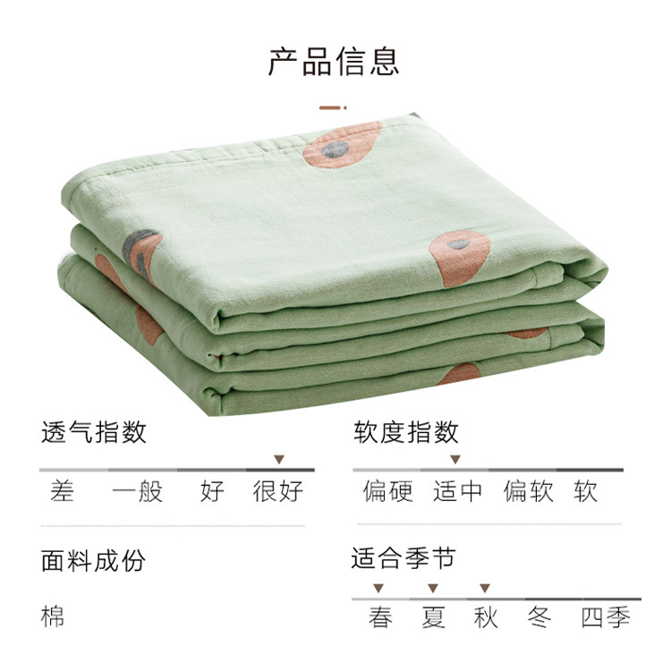 商品名称:朴尔 2020年新款水果系列四层纱布毛巾被 牛油果女孩-绿灰