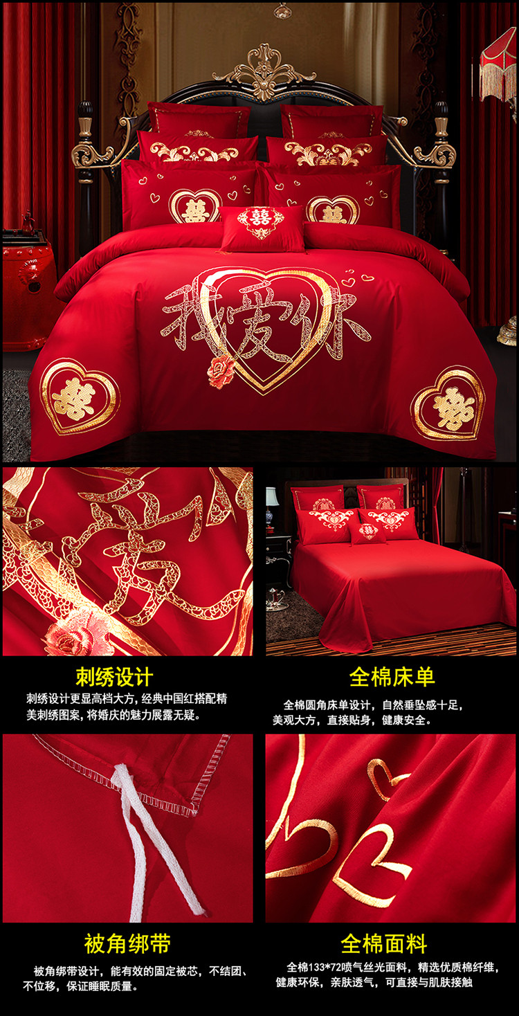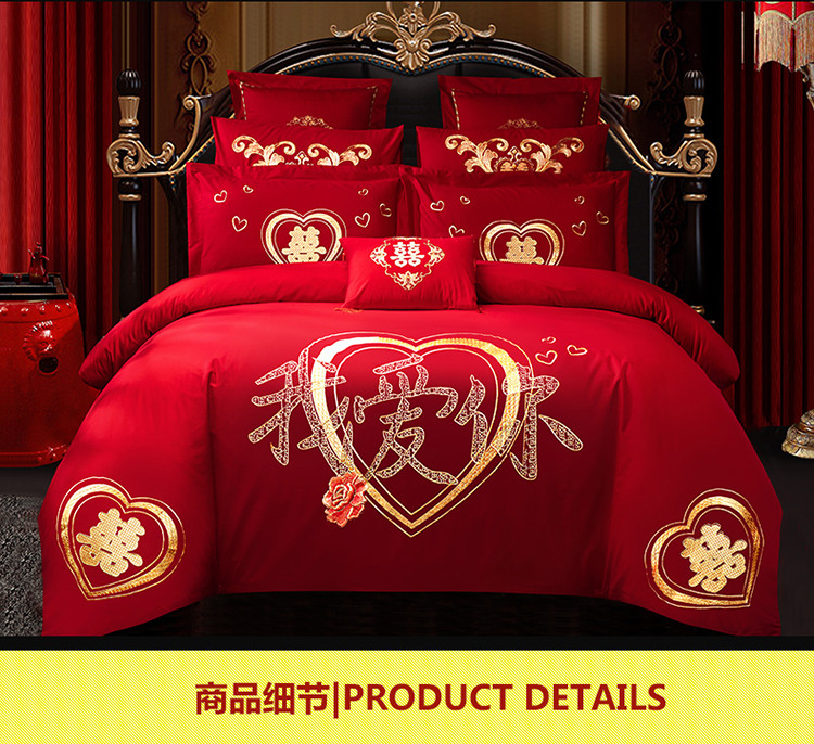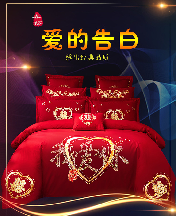 慕她 婚庆四件套大红色刺绣全棉纯棉结婚多件套 爱的告白