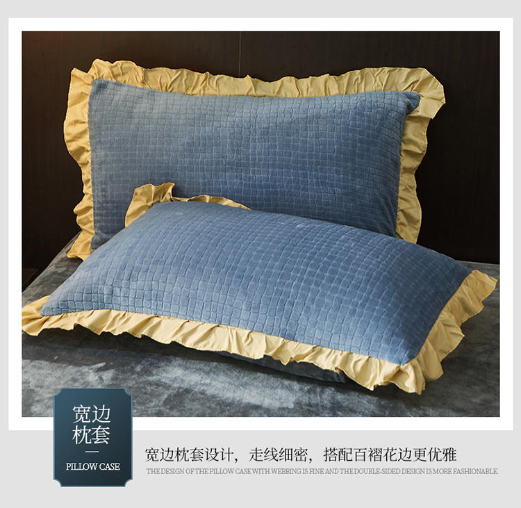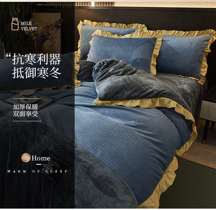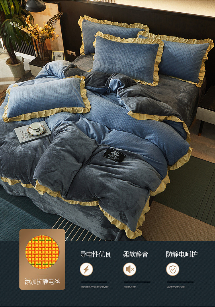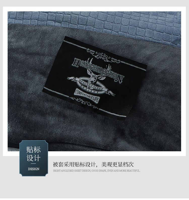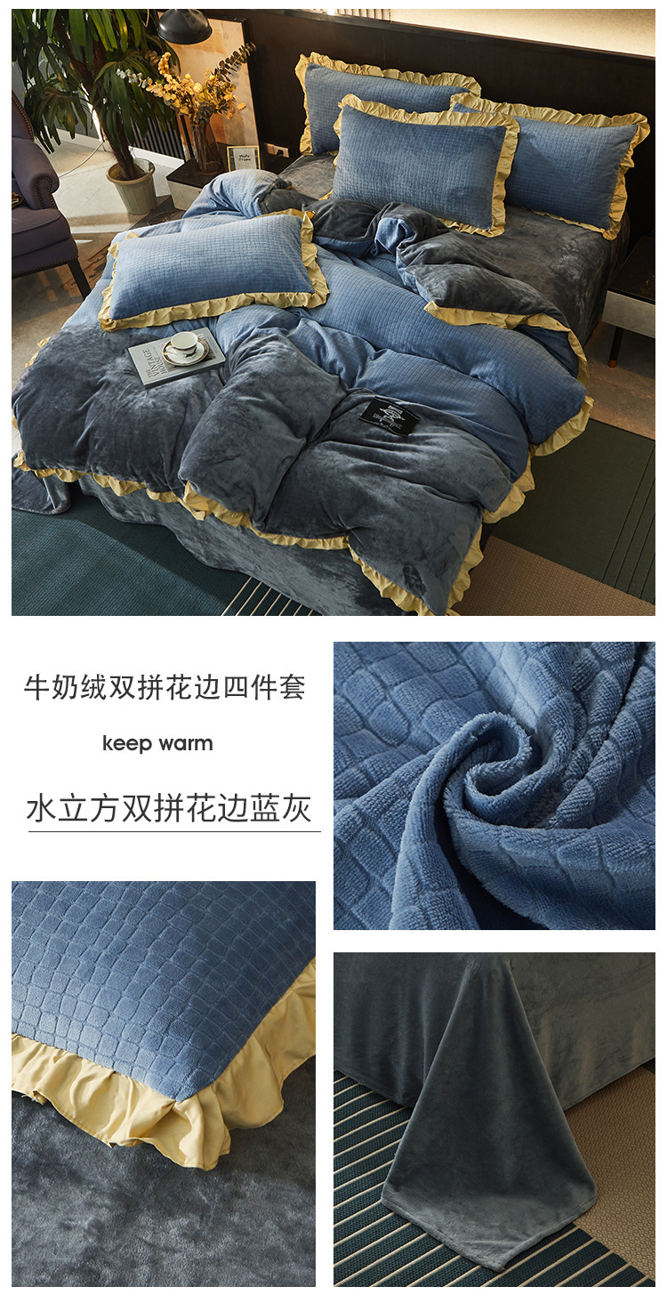 商品名称:芃成家纺 新款牛奶绒双拼花边四件套 水立方双拼花边蓝灰