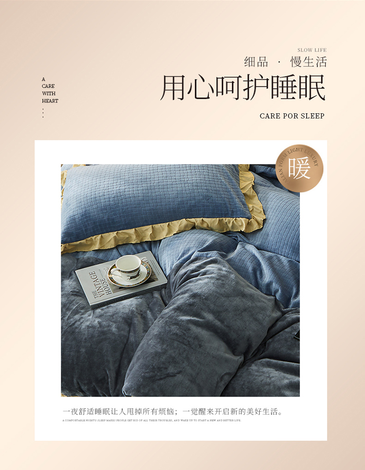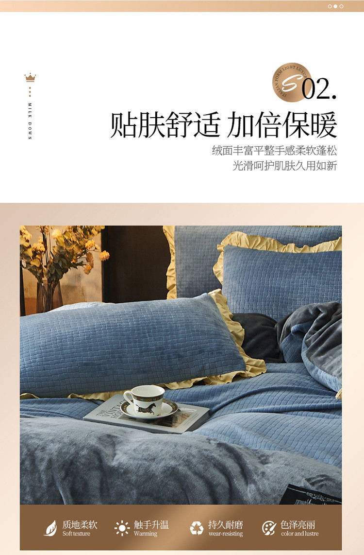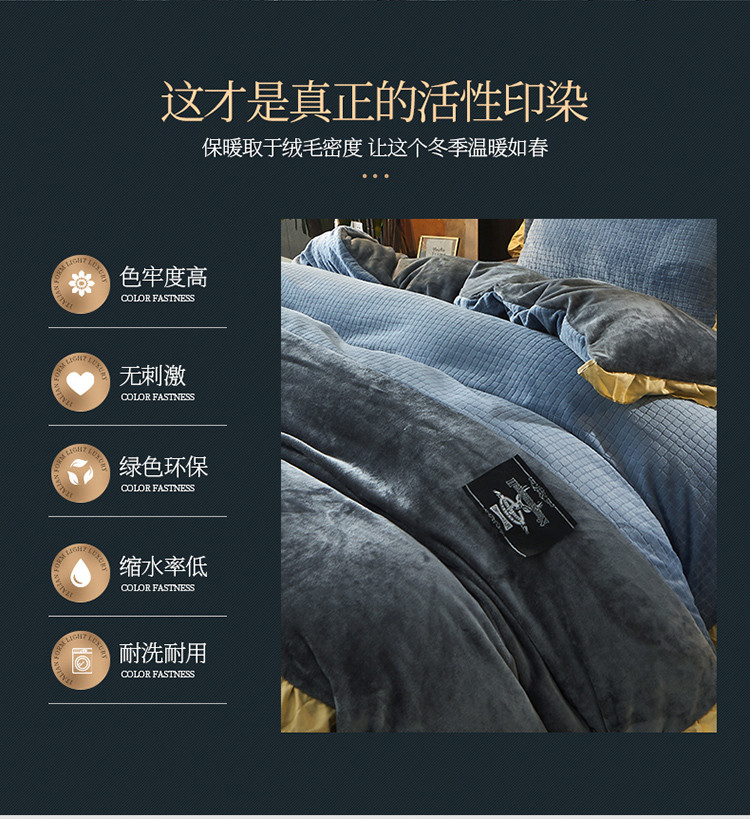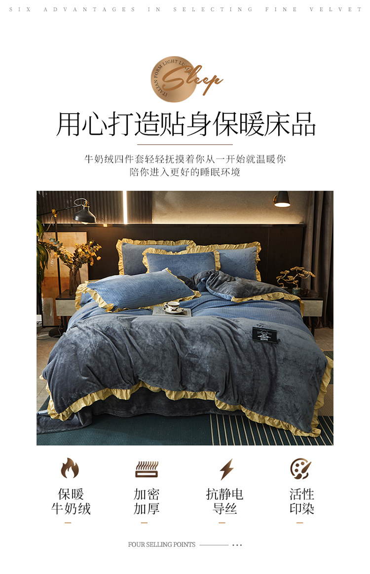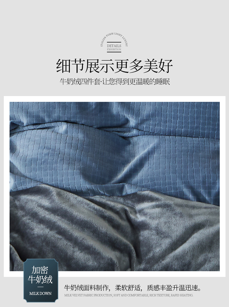 商品名称:芃成家纺 新款牛奶绒双拼花边四件套 水立方双拼花边蓝灰