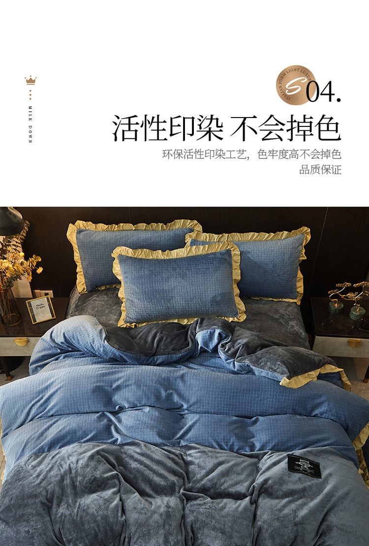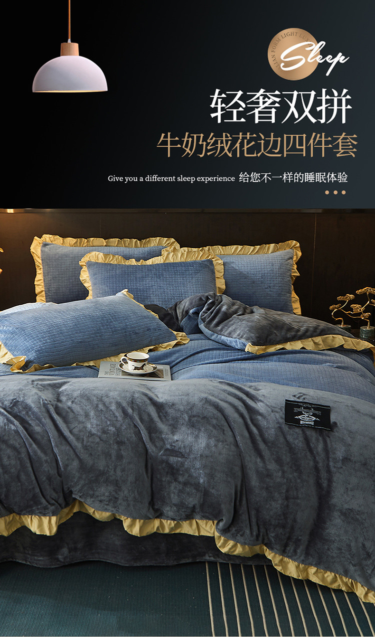 芃成家纺 新款牛奶绒双拼花边四件套 水立方双拼花边蓝灰