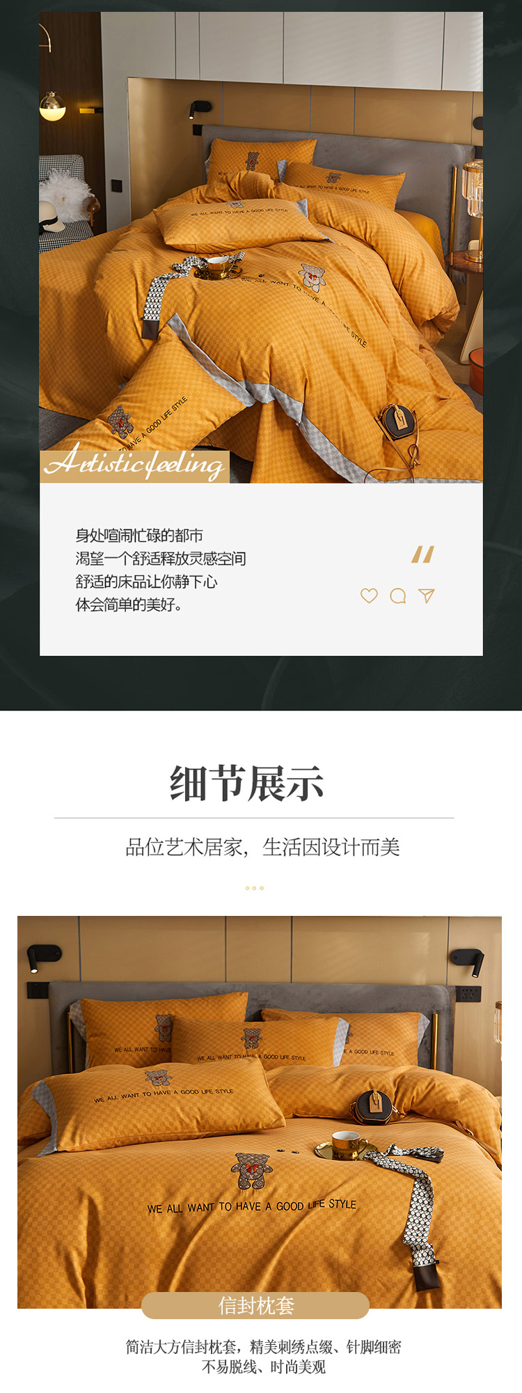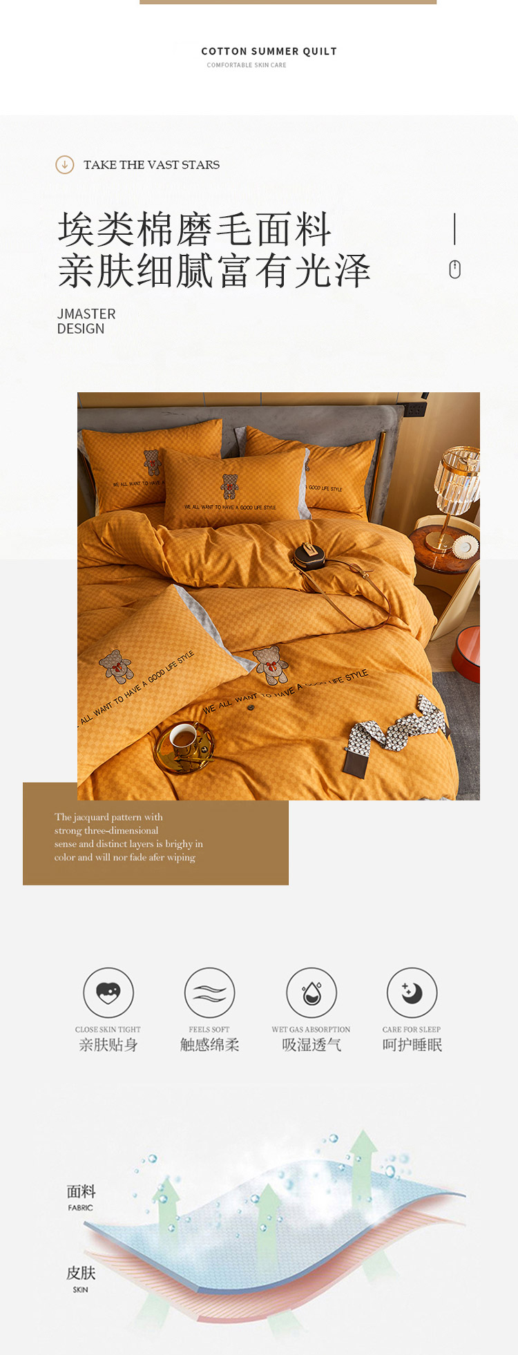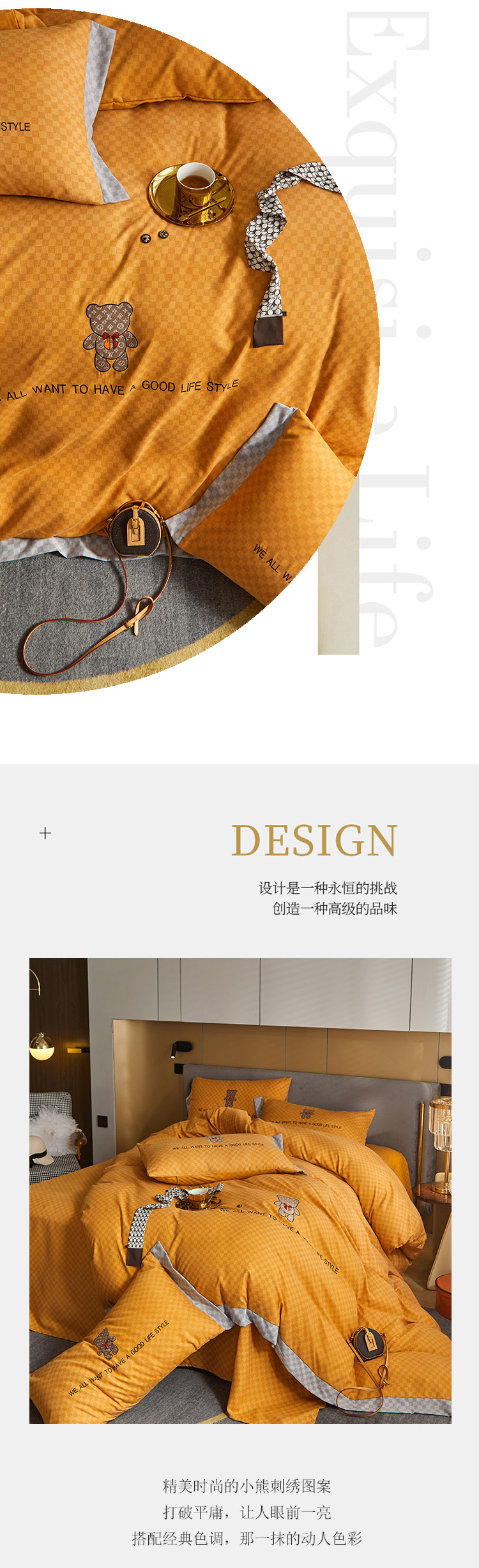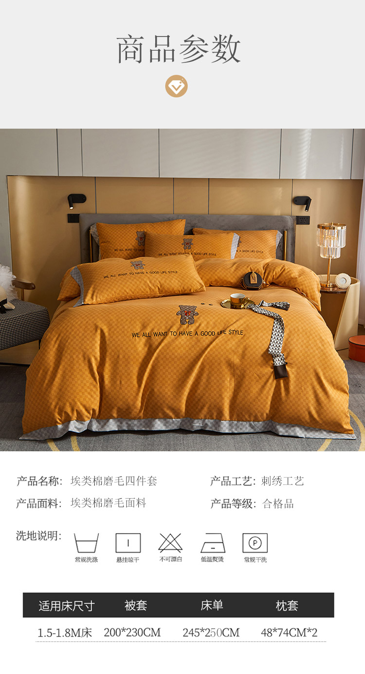 商品名称:凡客 2021秋冬新款埃类棉刺绣磨毛四件套-熊 轻奢熊-落日橙