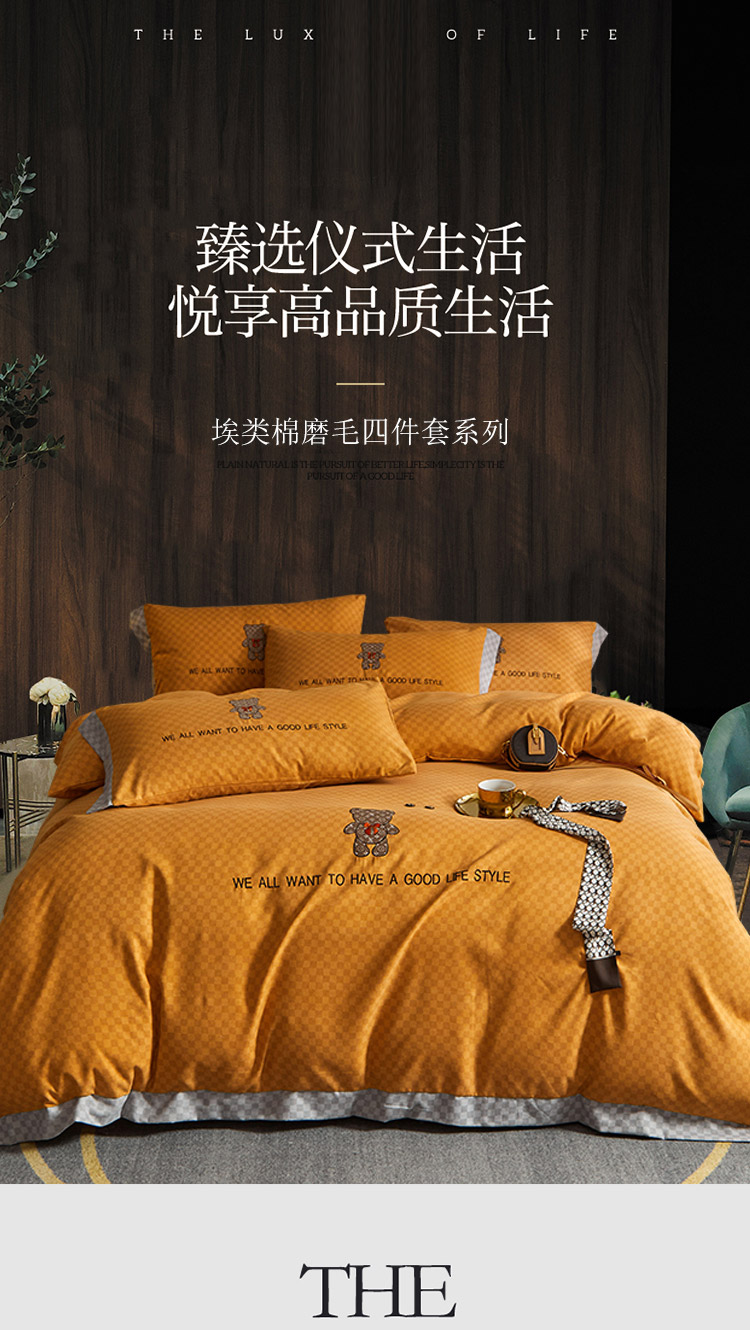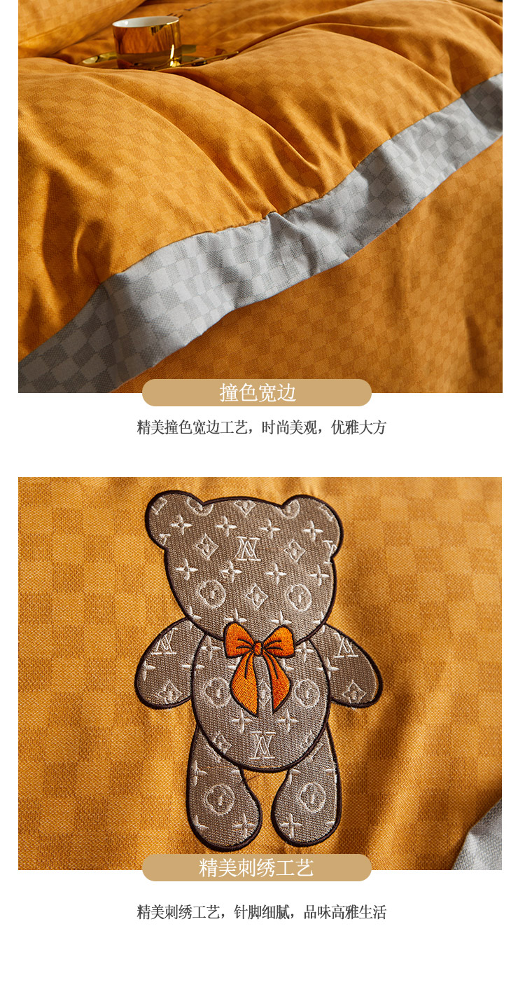 凡客 2021秋冬新款埃类棉刺绣磨毛四件套-熊 轻奢熊-落日橙