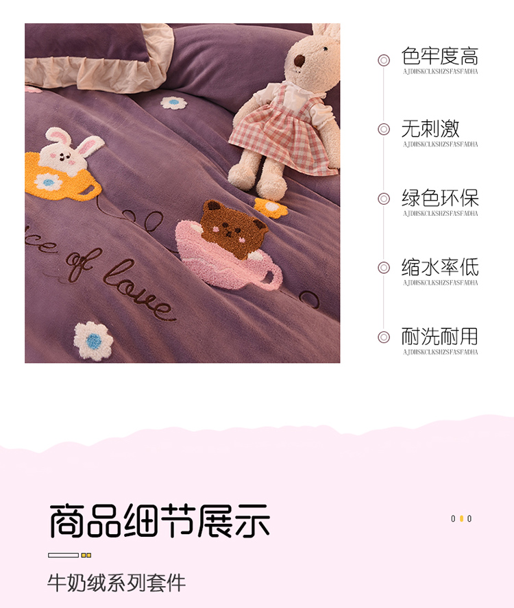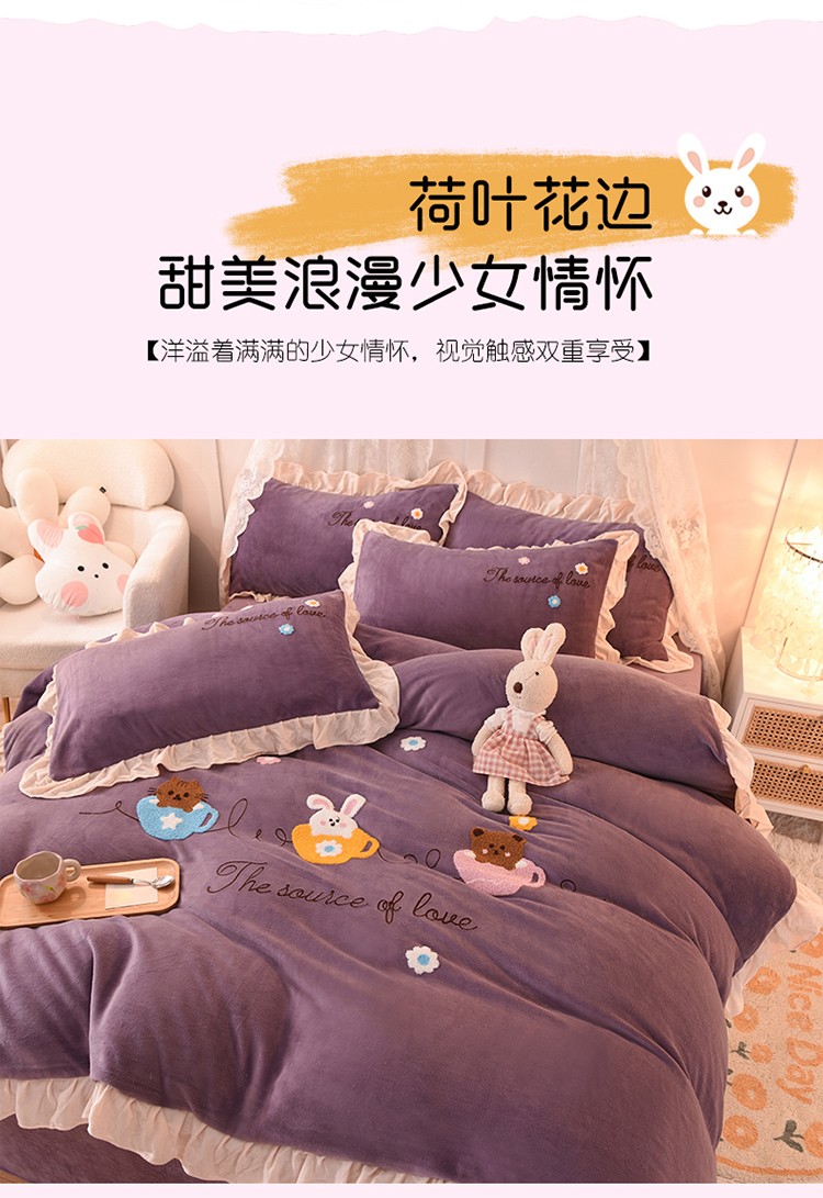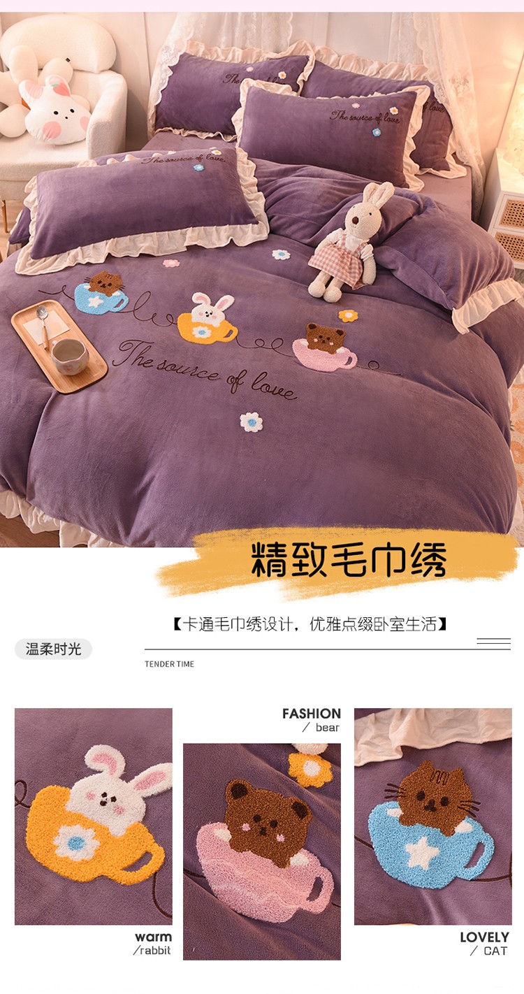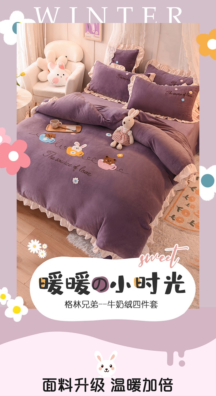 大米家居2023新款卡通毛巾绣牛奶绒宝宝绒四件套格林兄弟紫薇