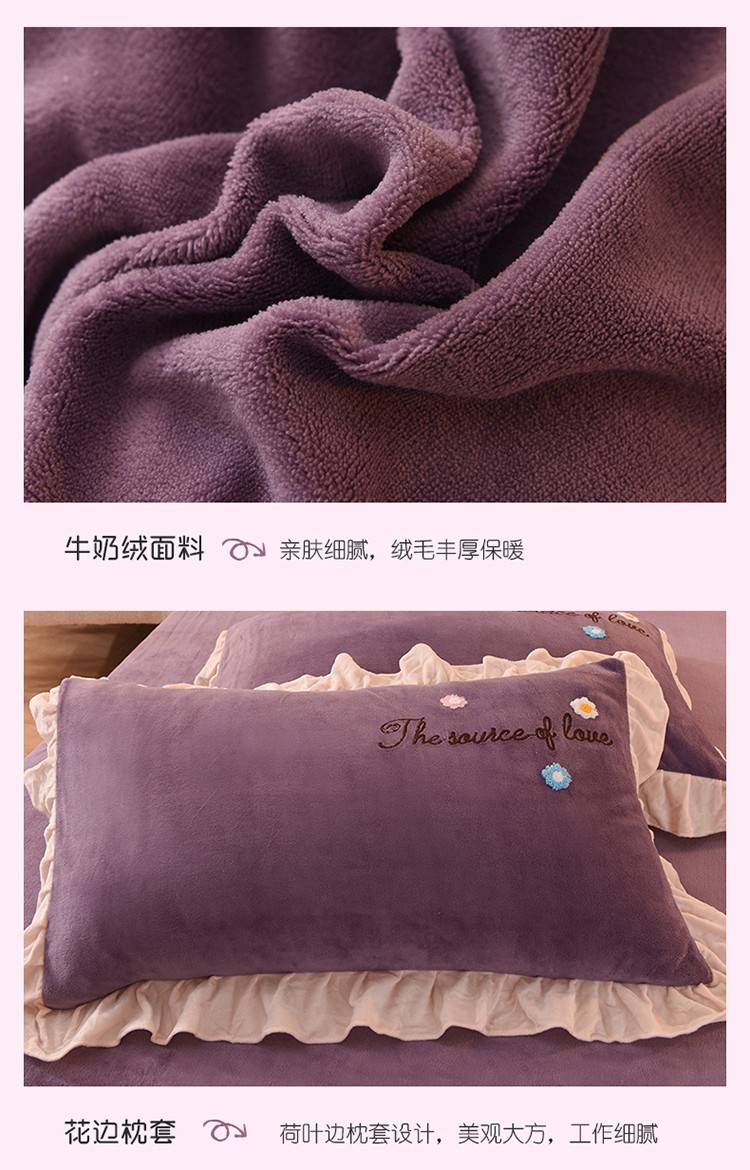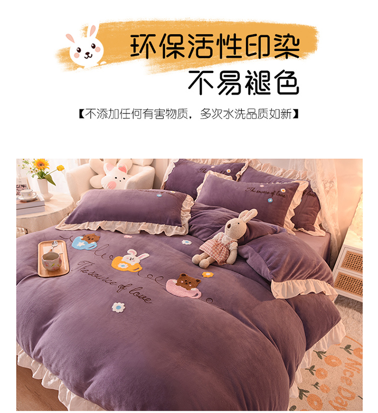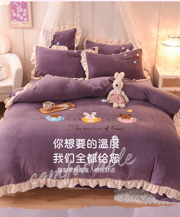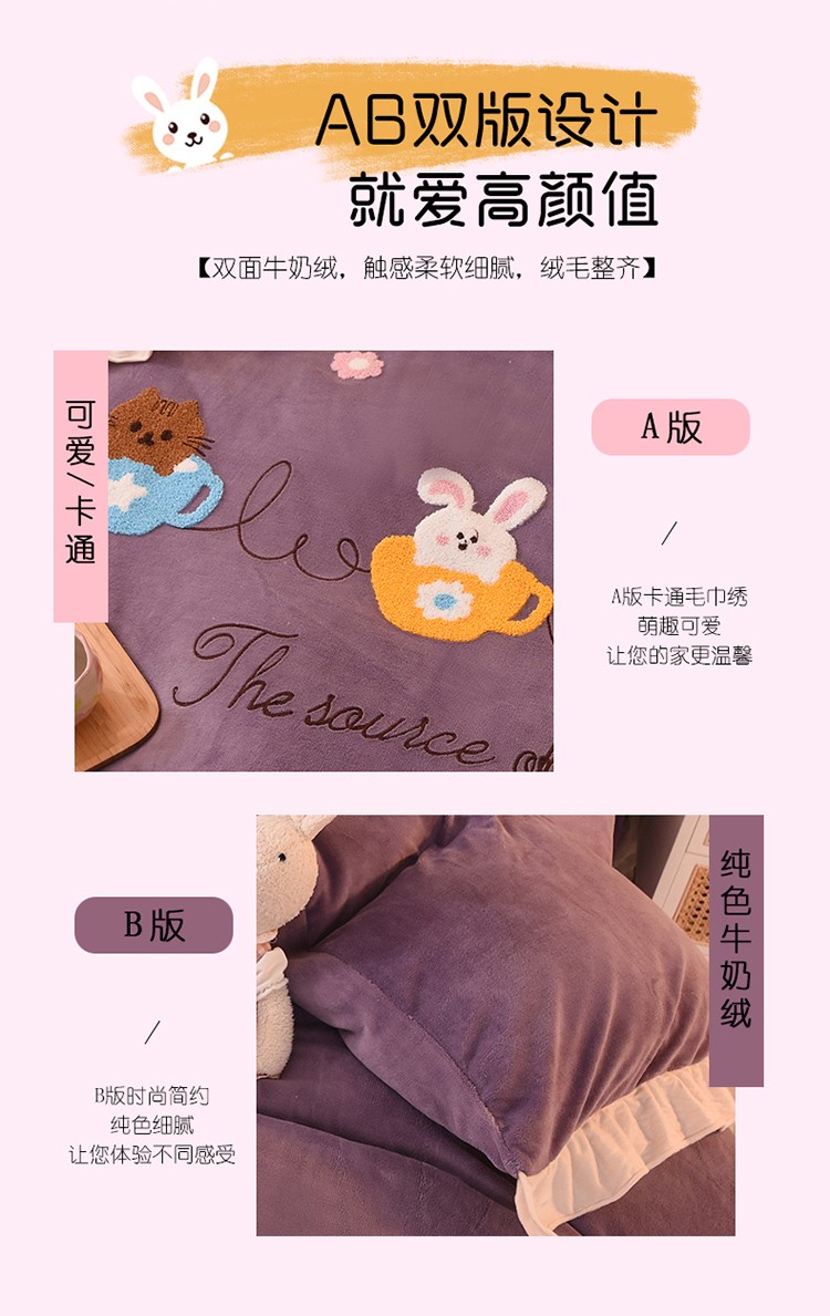 大米家居2023新款卡通毛巾绣牛奶绒宝宝绒四件套格林兄弟紫薇