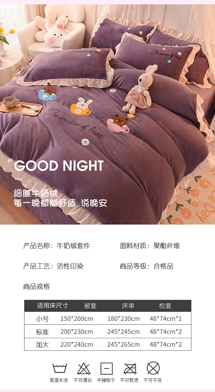 商品名称:大米家居2023新款卡通毛巾绣牛奶绒宝宝绒四件套格林兄弟紫薇