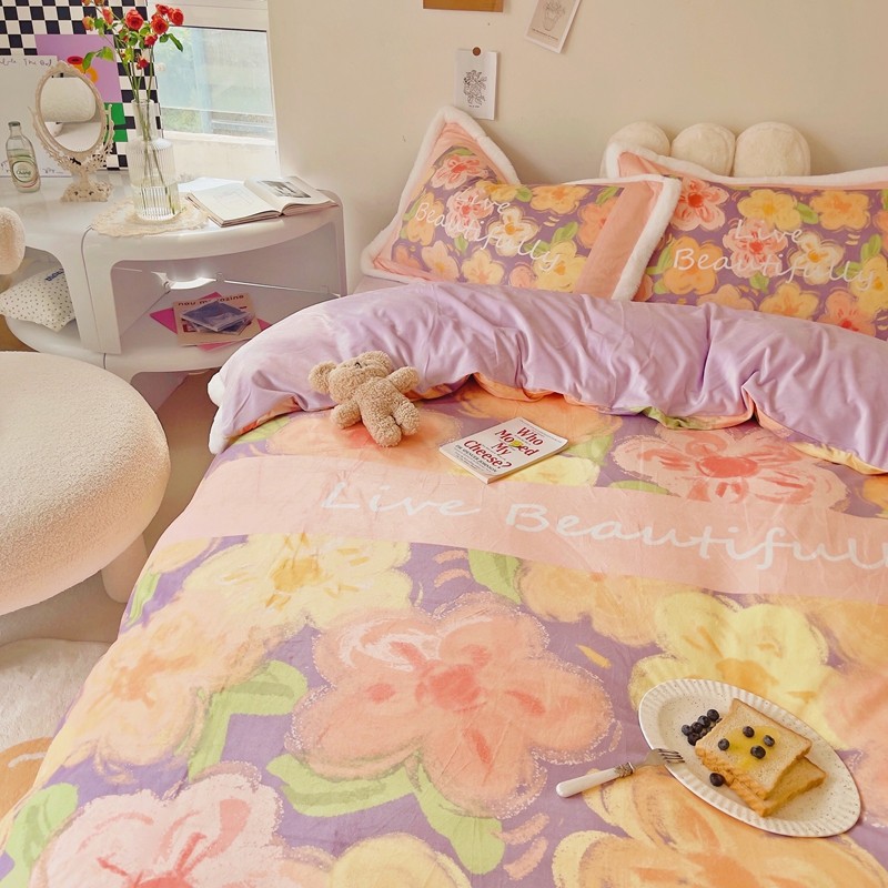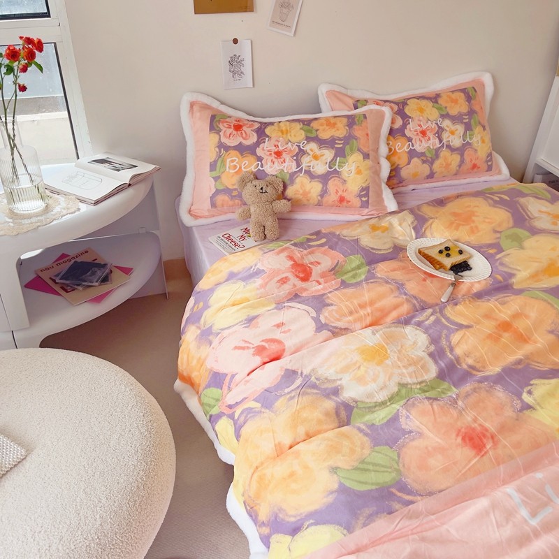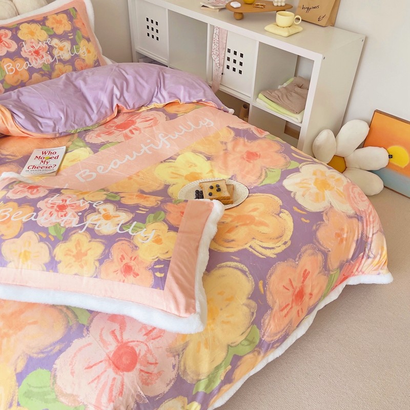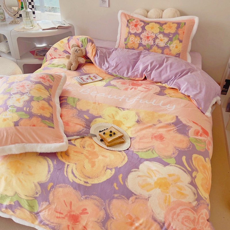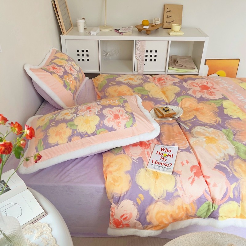 圆岛家纺 新款冬季数码印花高档婴儿绒兔兔绒四件套 花田