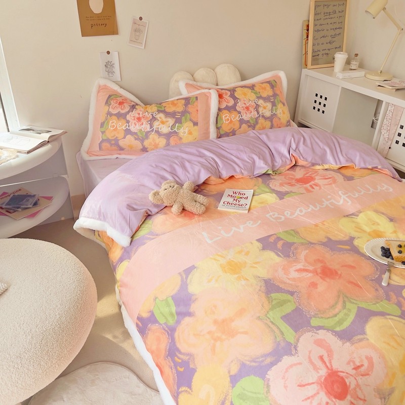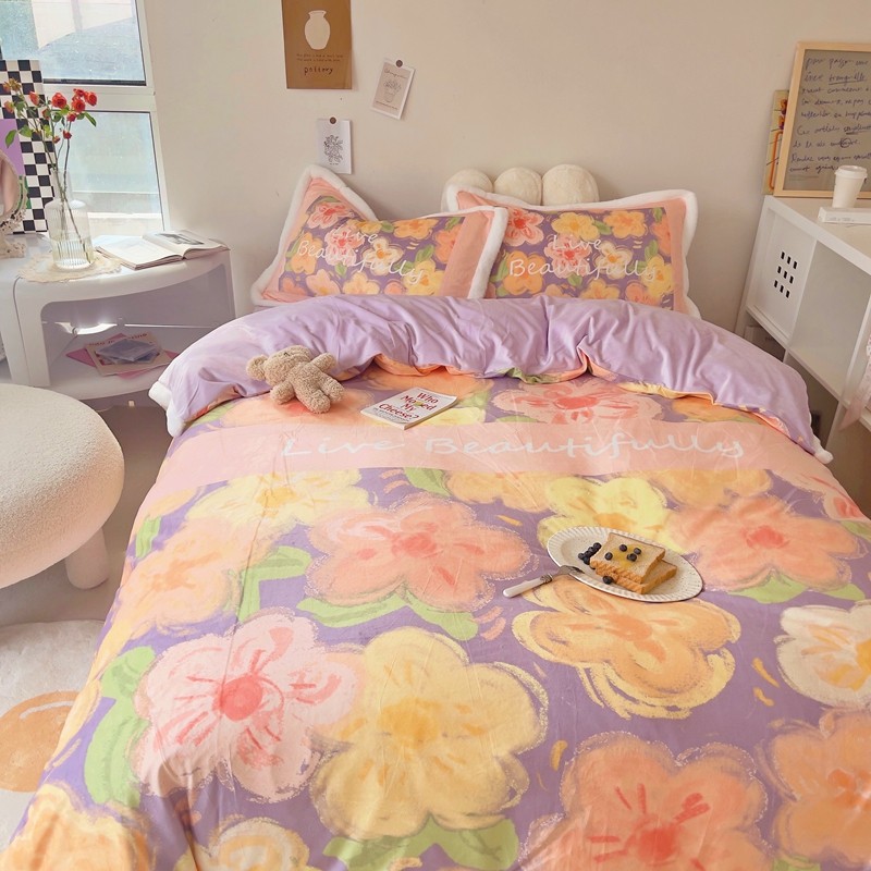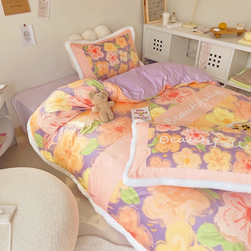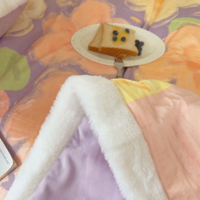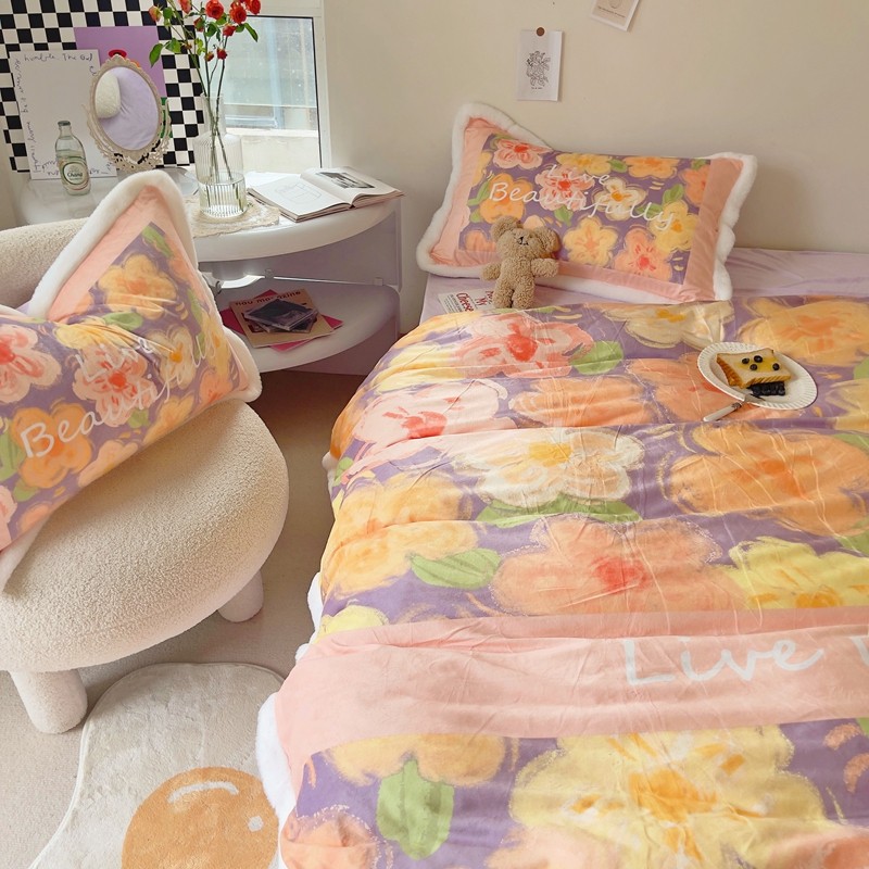 圆岛家纺 新款冬季数码印花高档婴儿绒兔兔绒四件套 花田