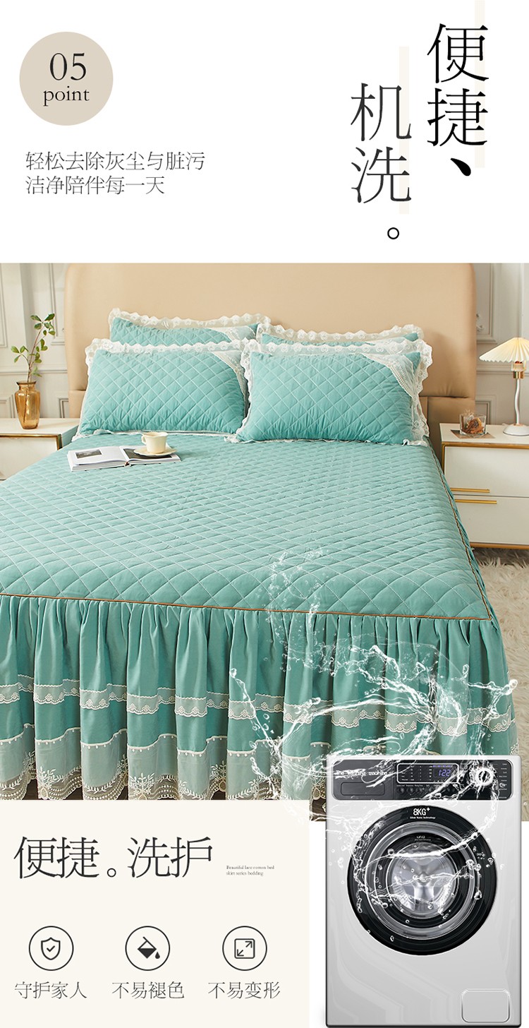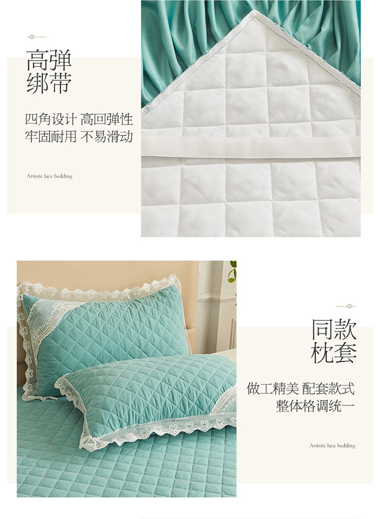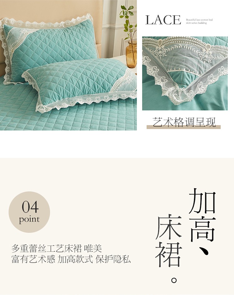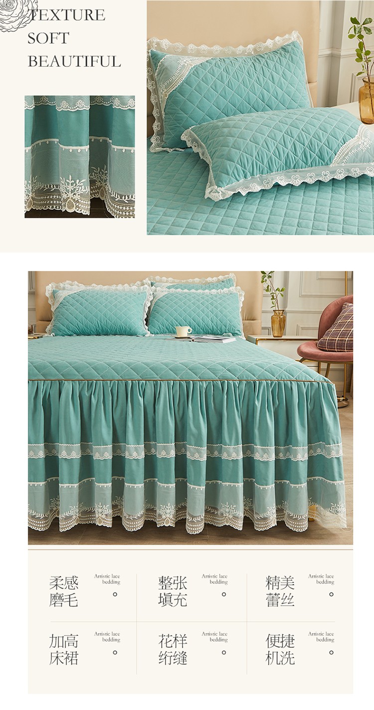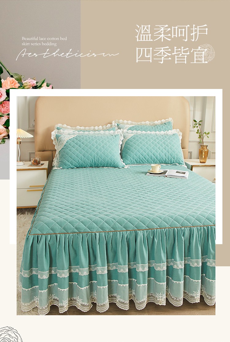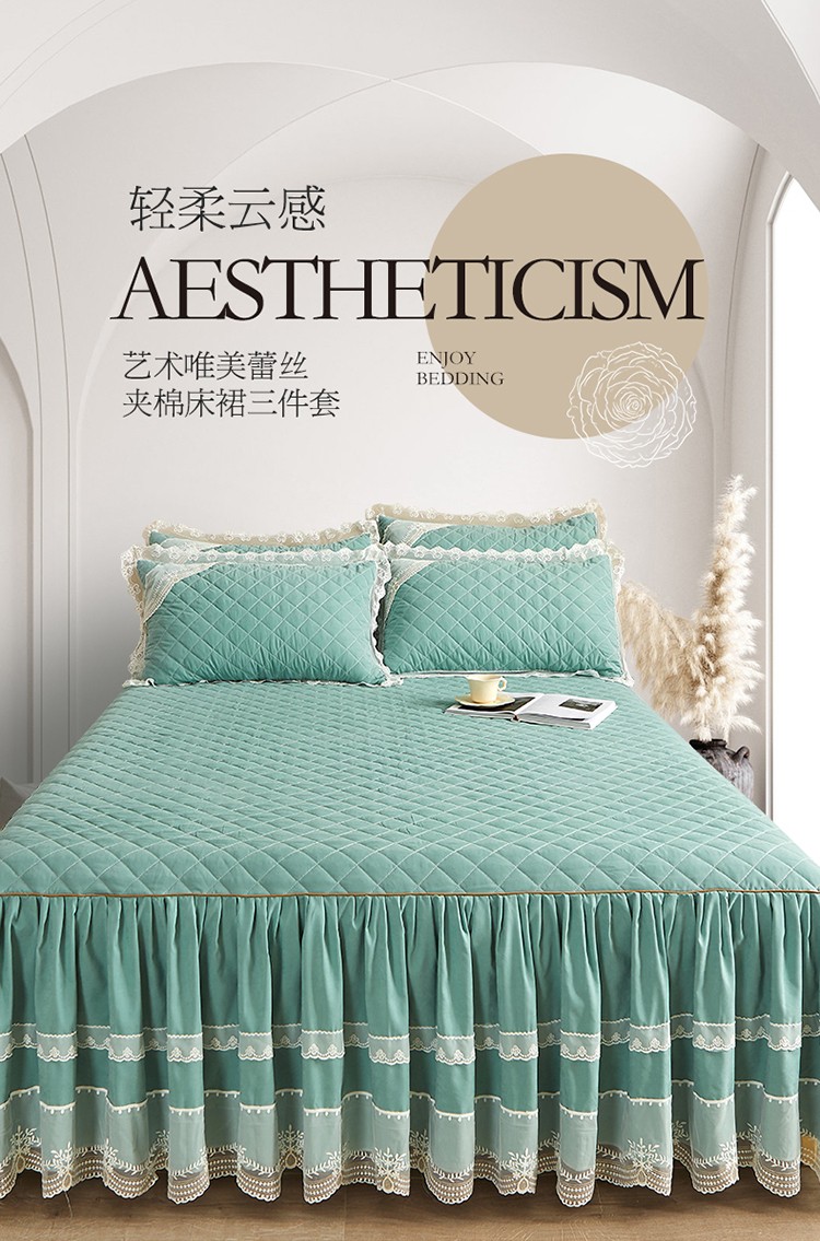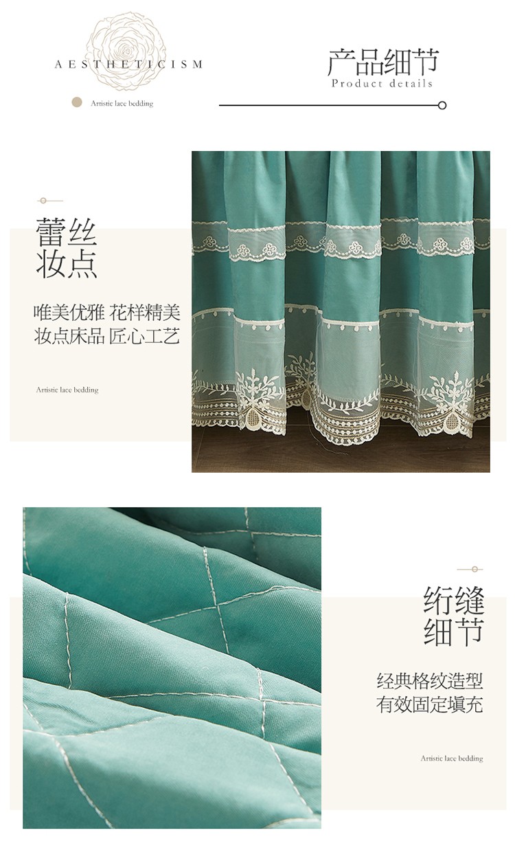 商品名称:网红馆 2025新款唯美蕾丝夹棉床裙三件套婉约佳人 青绿色