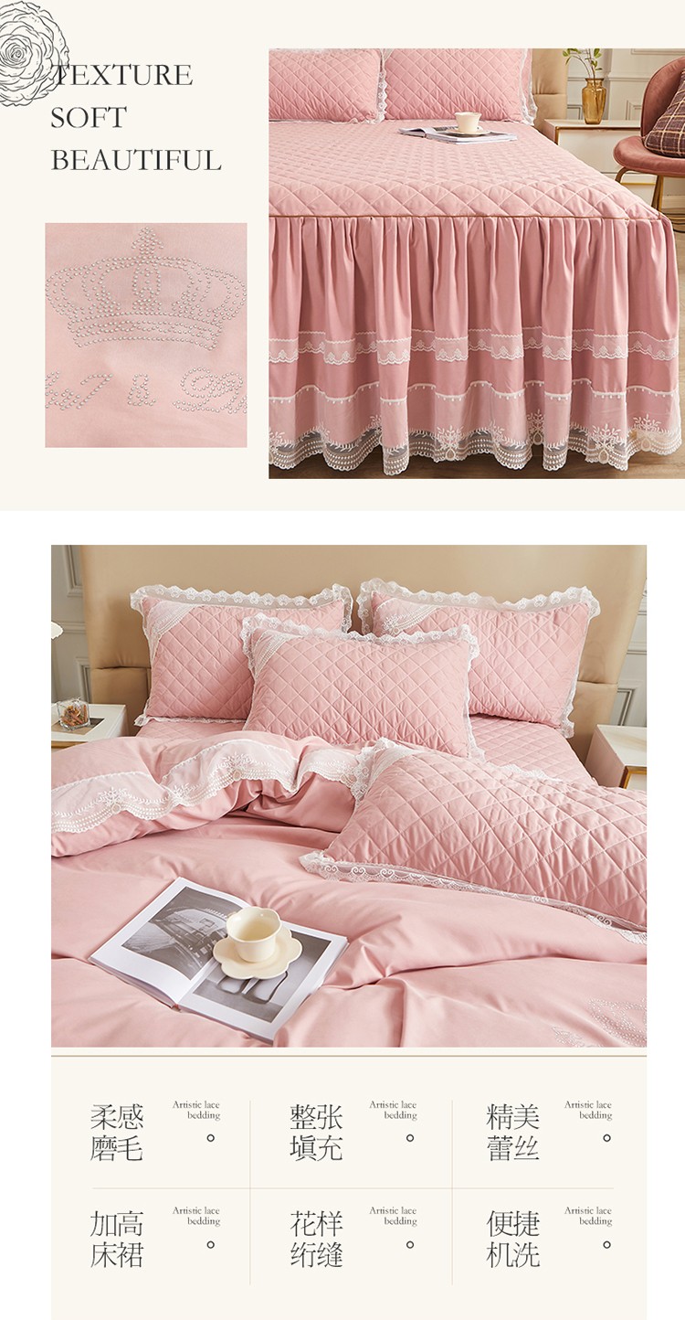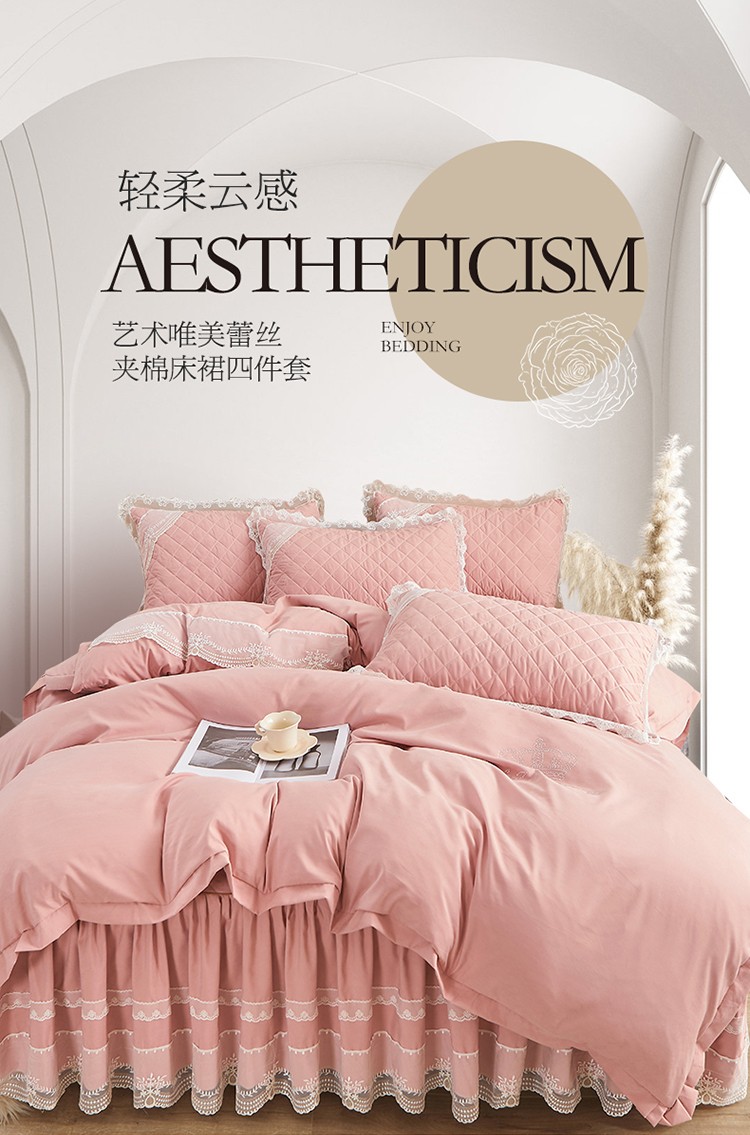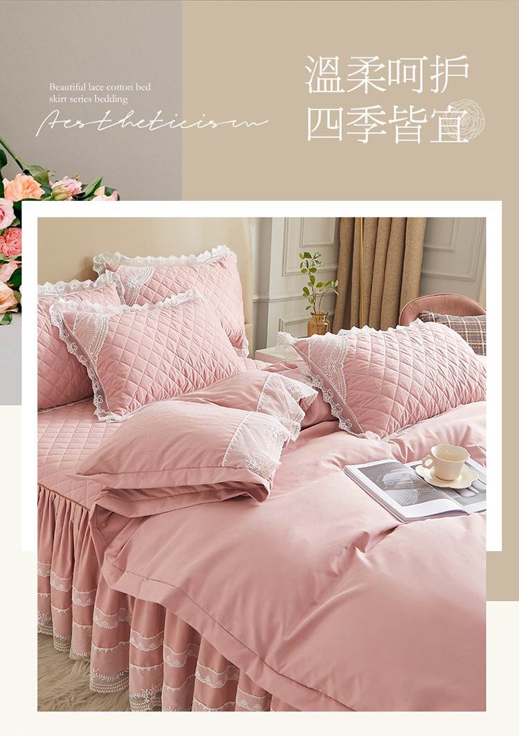 网红馆 2025新款唯美蕾丝夹棉床裙四件套婉约佳人 桃花粉