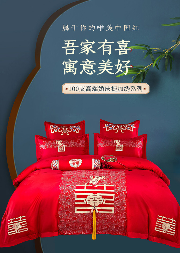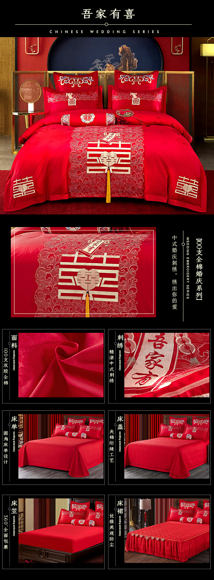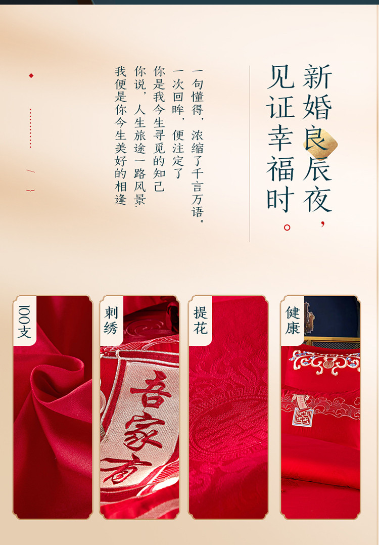 当前位置: 91家纺网 > 商品网购 > 床品套件 > 四件套 > 婚庆四件套 > 2025新款120S全棉刺绣贡缎提花婚庆四件套多件套吾家有喜