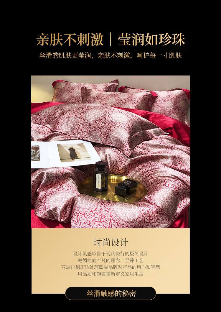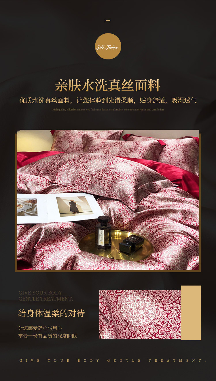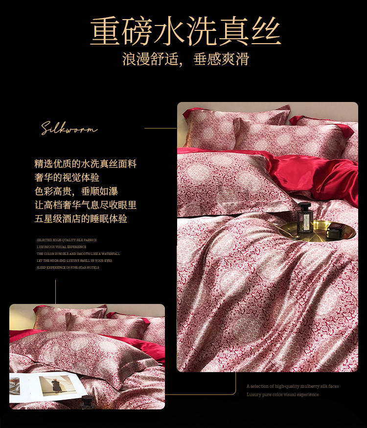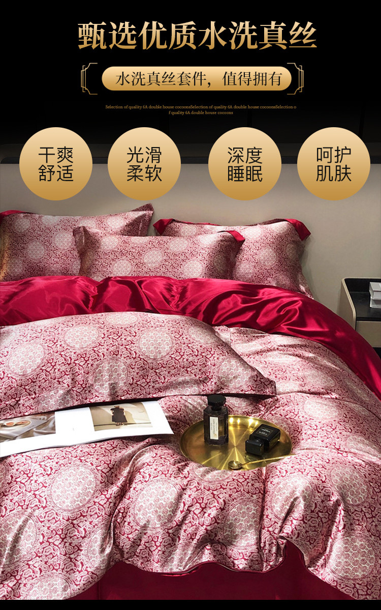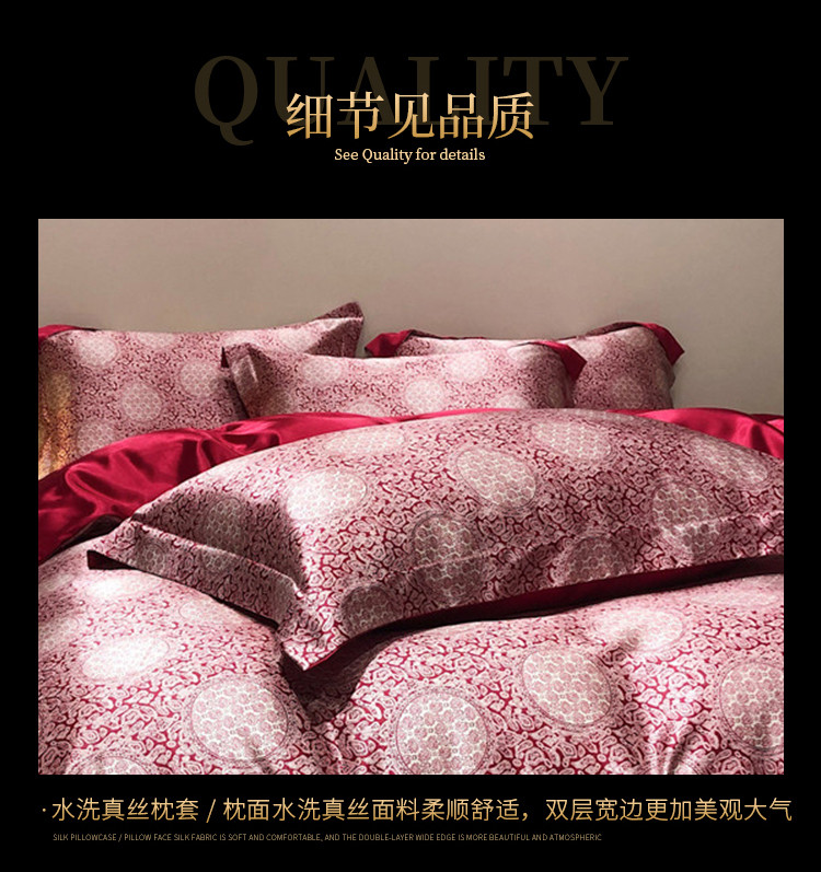 商品名称:黄鹂鸟 2025新款高端轻奢丝滑裸睡丝绸数码印花水洗真丝天丝四件套系列 -风格一花好月圆红