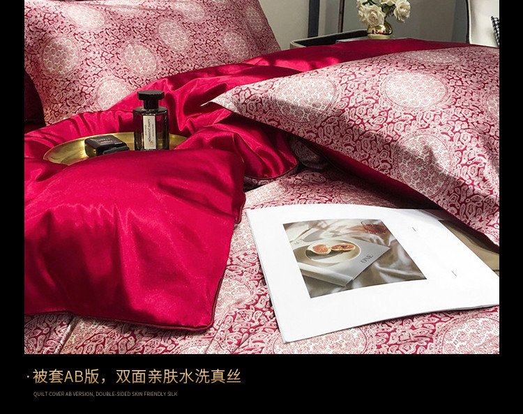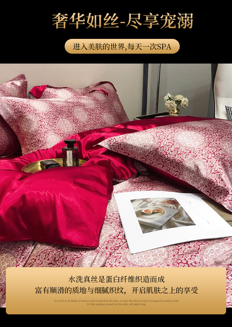 黄鹂鸟 2025新款高端轻奢丝滑裸睡丝绸数码印花水洗真丝天丝四件套系列 -风格一花好月圆红