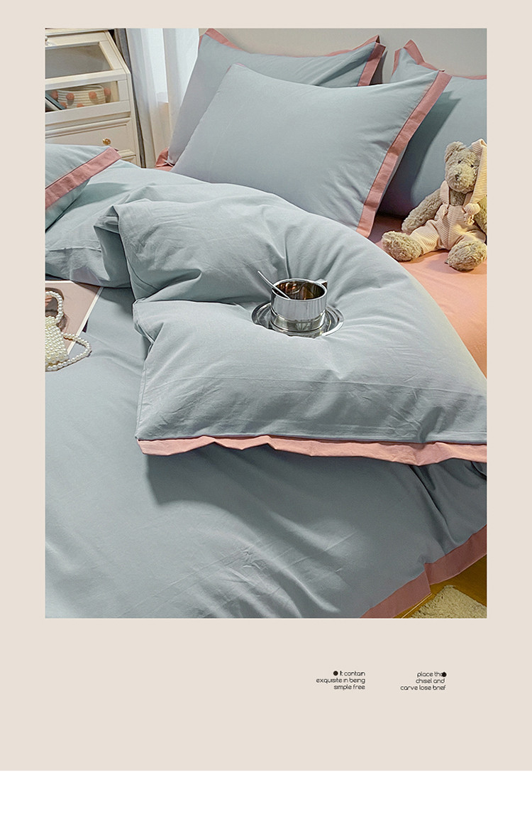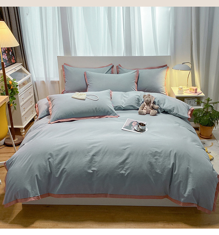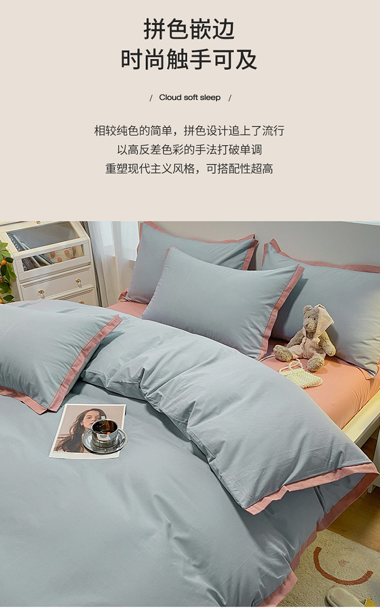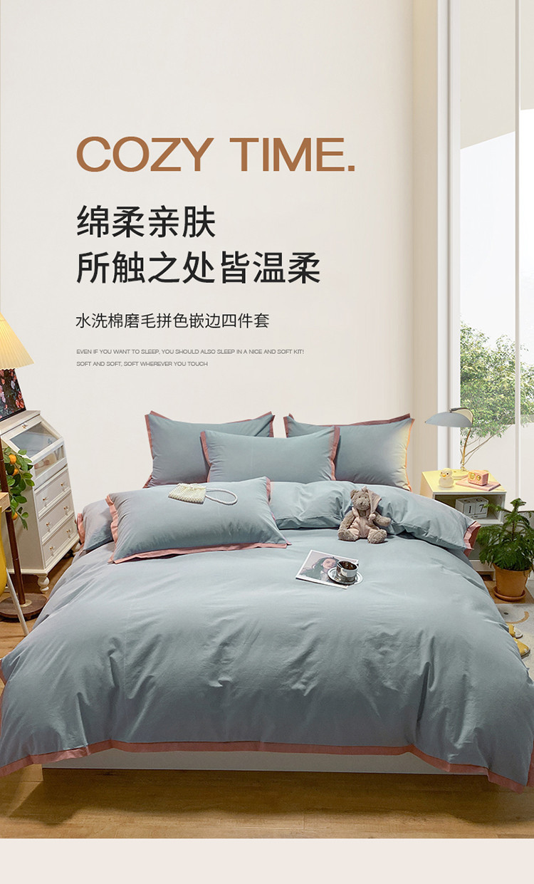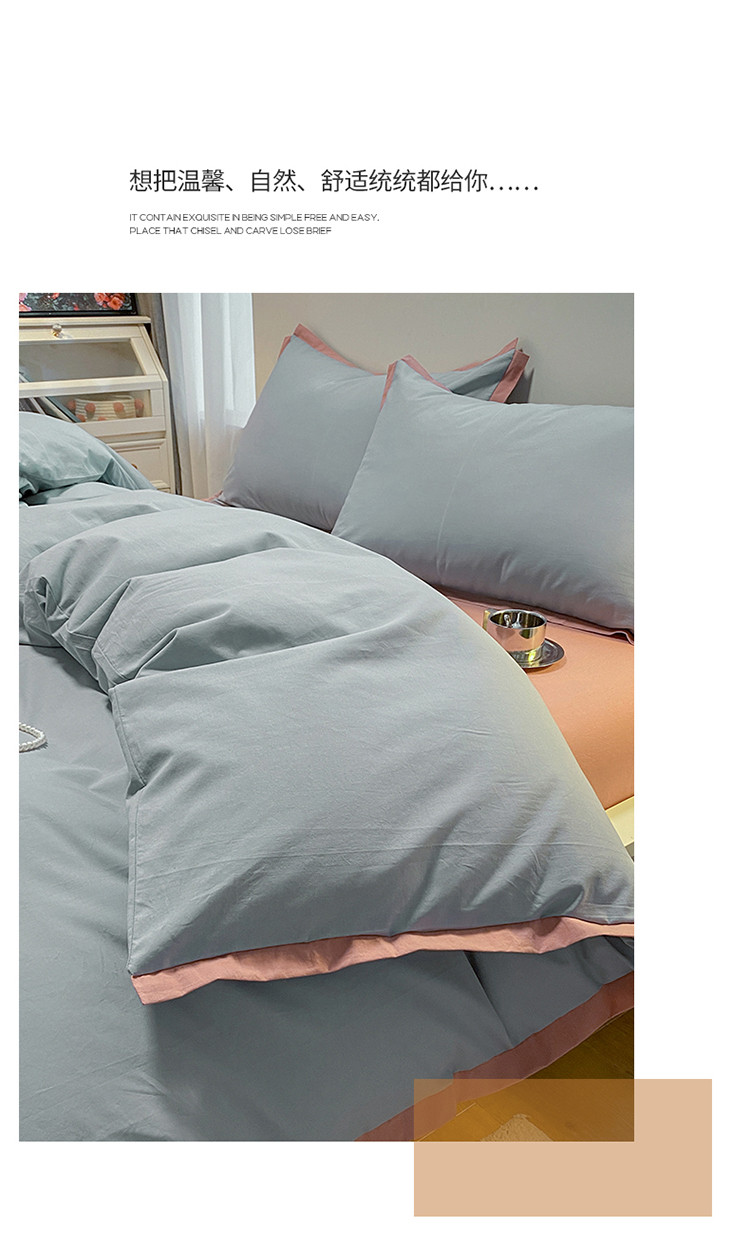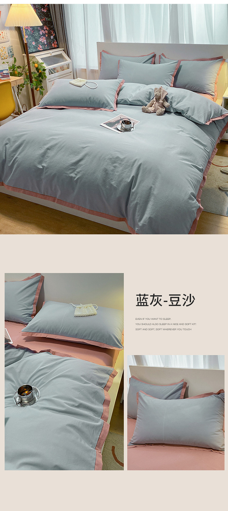 当前位置: 91家纺网 > 商品网购 > 床品套件 > 四件套 > 普通磨毛四件套 > 眠帛家居 2022新款水洗棉磨毛拼色嵌边四件套 蓝灰-豆沙