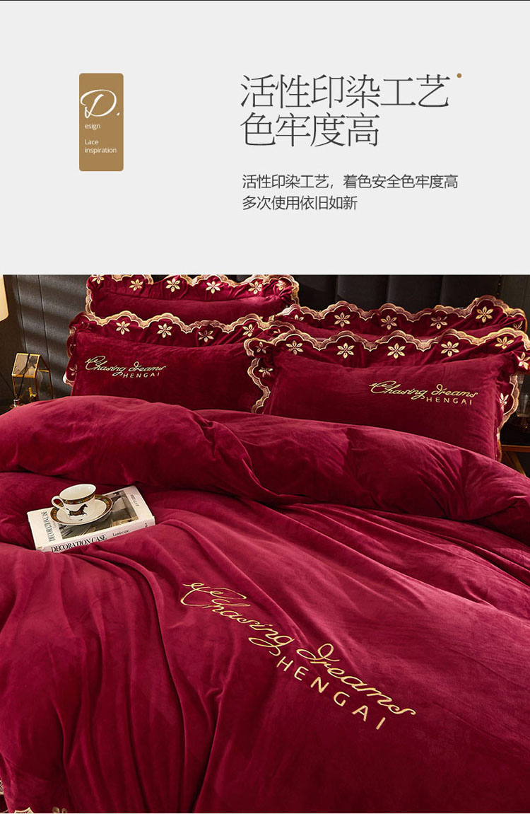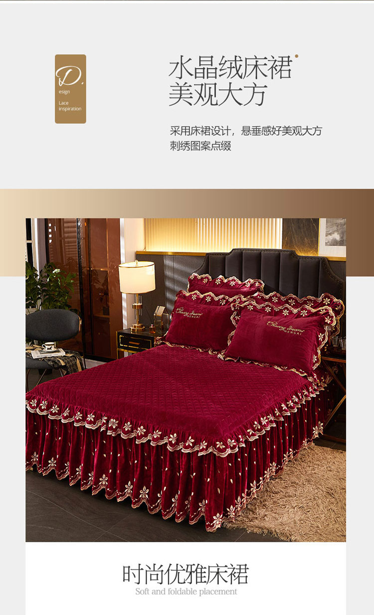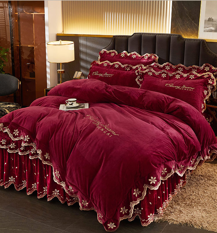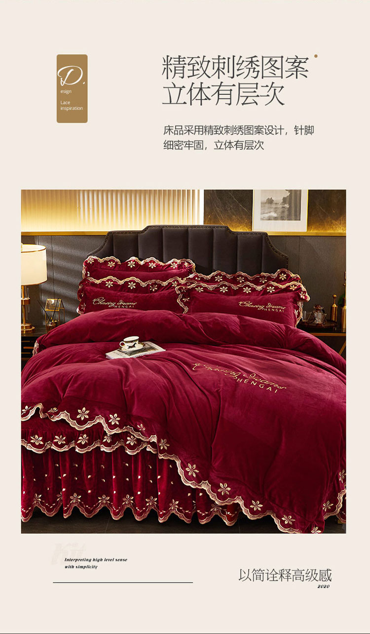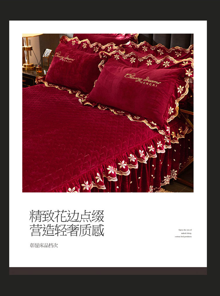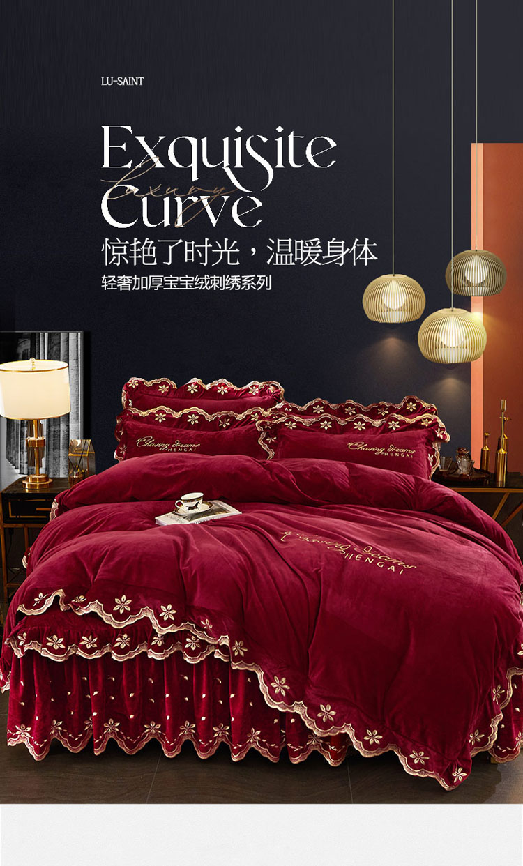 当前位置: 91家纺网 > 商品网购 > 床品套件 > 四件套 > 宝宝绒四件套 > 恒爱 2022新款秋冬轻奢宝宝绒刺绣床裙款四件套 酒红