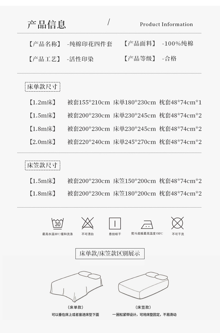 床笠款1.5米床;被套尺寸200*230,床笠150*200cm 枕套74*48*2 | ¥130.00 |