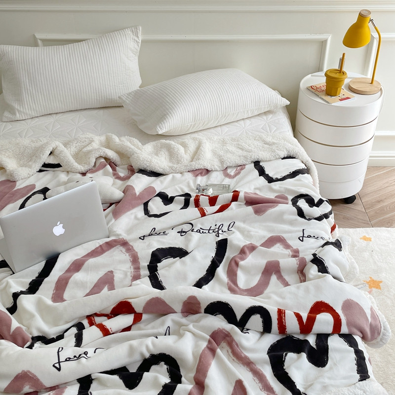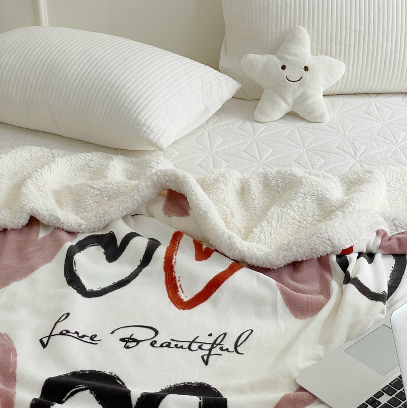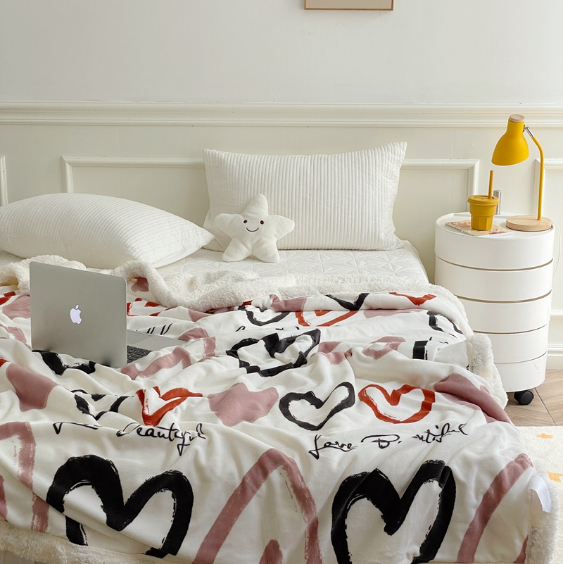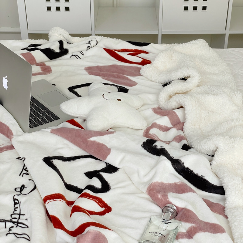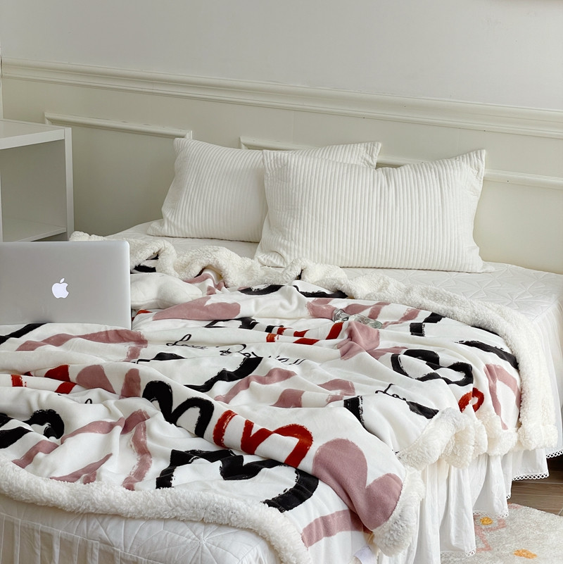 时年 2022新款牛奶绒拼羊羔绒毯 爱心结