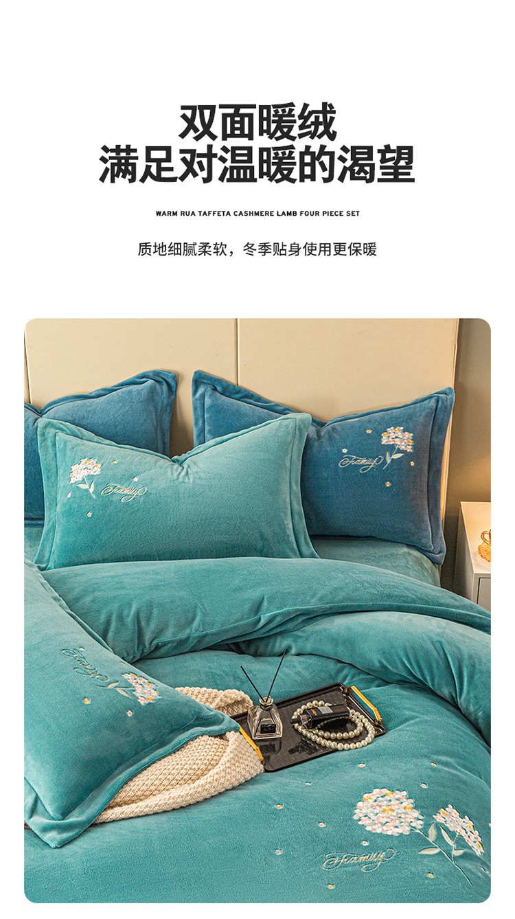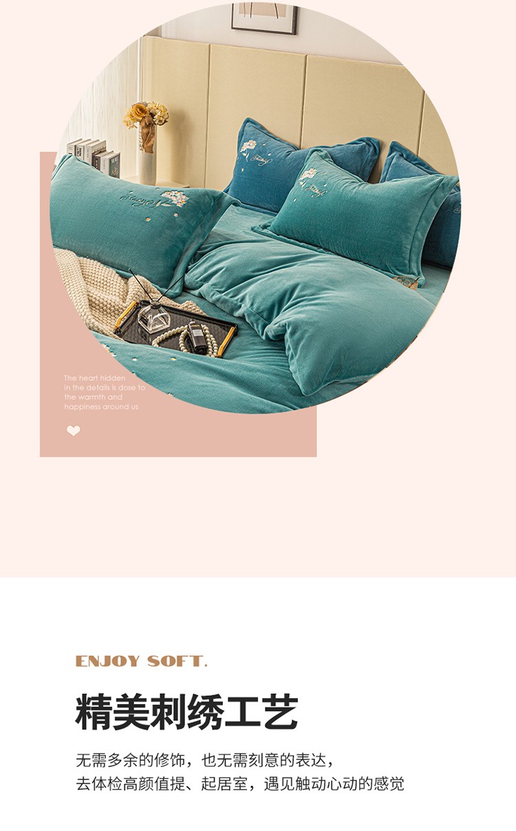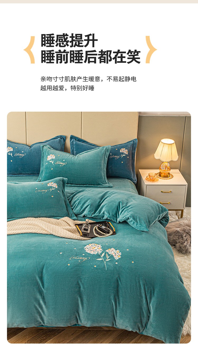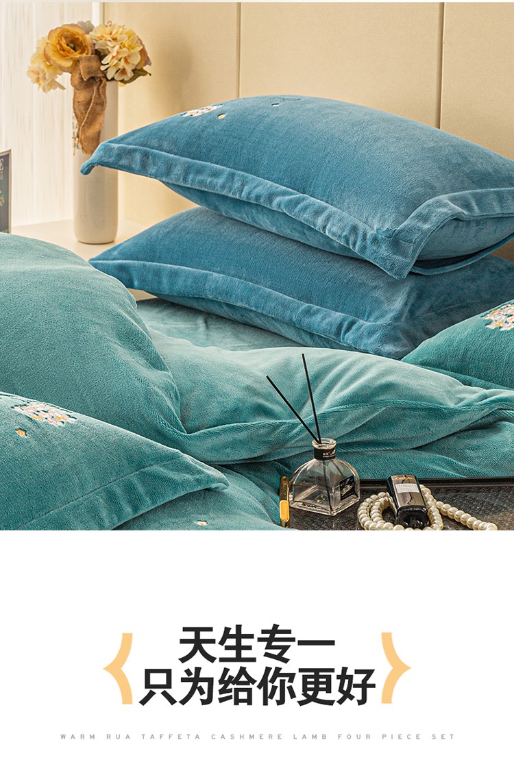 商品名称:名品优仓 2022新款刺绣牛奶绒200克四件套-绣花球 湖蓝