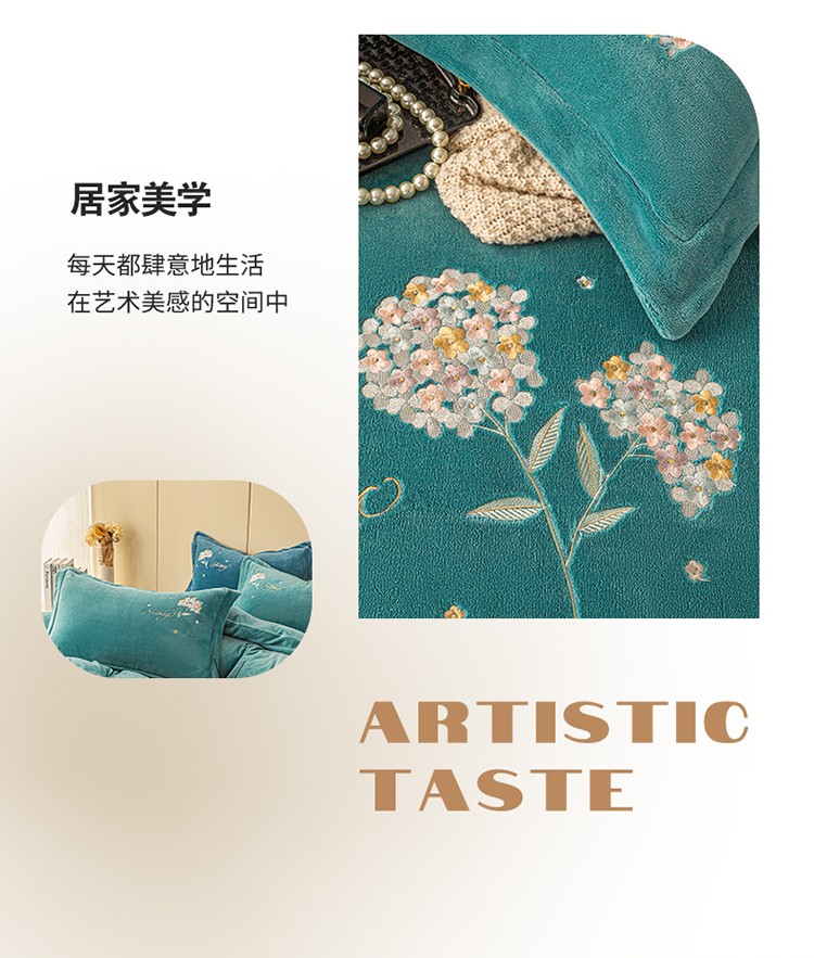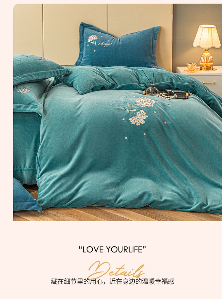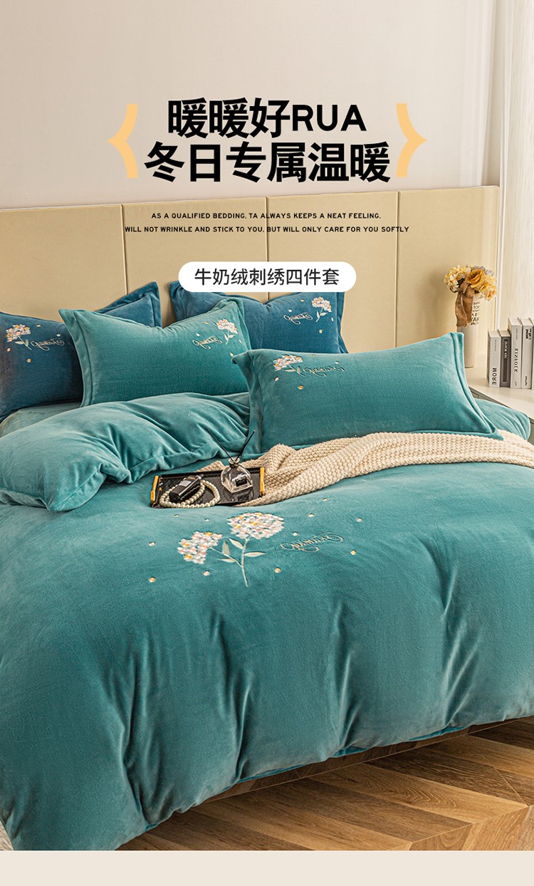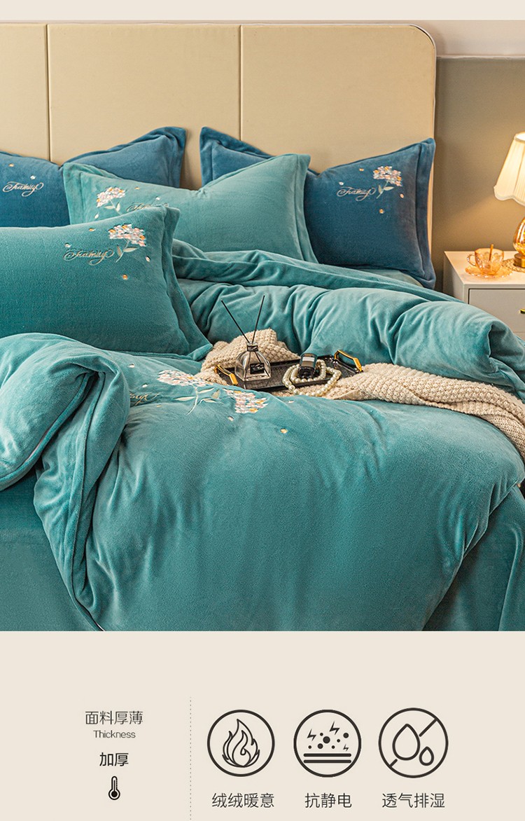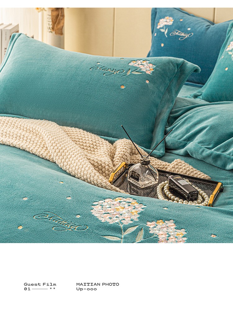 名品优仓 2022新款刺绣牛奶绒200克四件套-绣花球 湖蓝