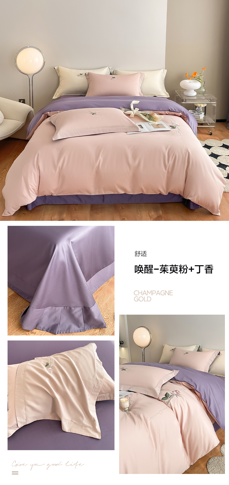 (总)秀色家纺 2025新款轻奢60支贡缎长绒纯棉四件套全棉简约清新刺绣花被套床单高级感,唤醒-奶昔白+茱萸粉,唤醒-天空蓝+茱萸粉,唤醒-奶昔白+天空蓝,唤醒-奶昔白+香槟金,唤醒-茱萸粉+烟墨灰,奶昔白+丁香,奶昔白+莺茶绿,茱萸粉+丁香,莺茶绿+香槟金,香槟金+烟墨灰