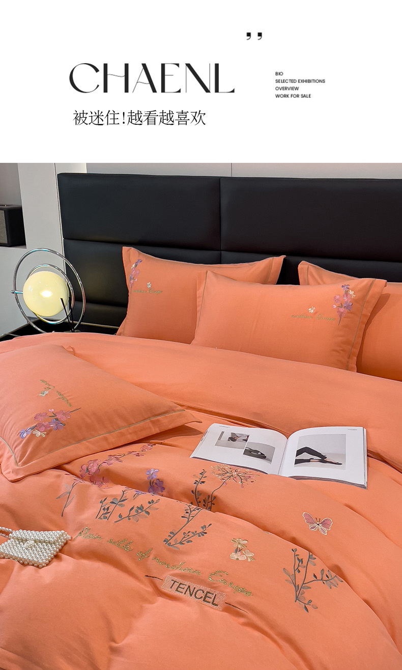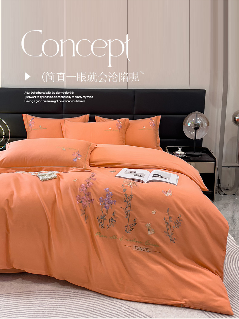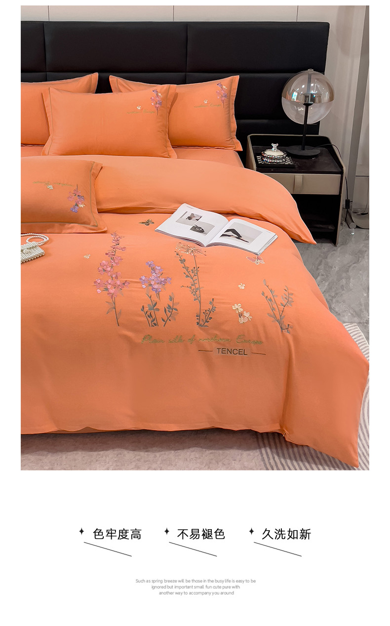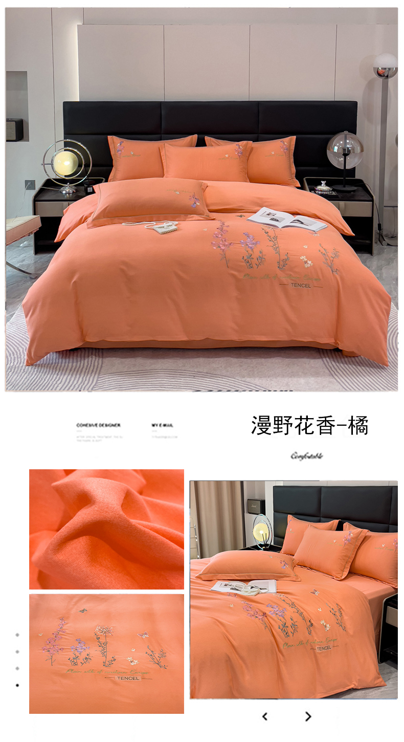 商品名称:云锦2023新款全棉磨毛绣花四件套系列 漫野花香橘色