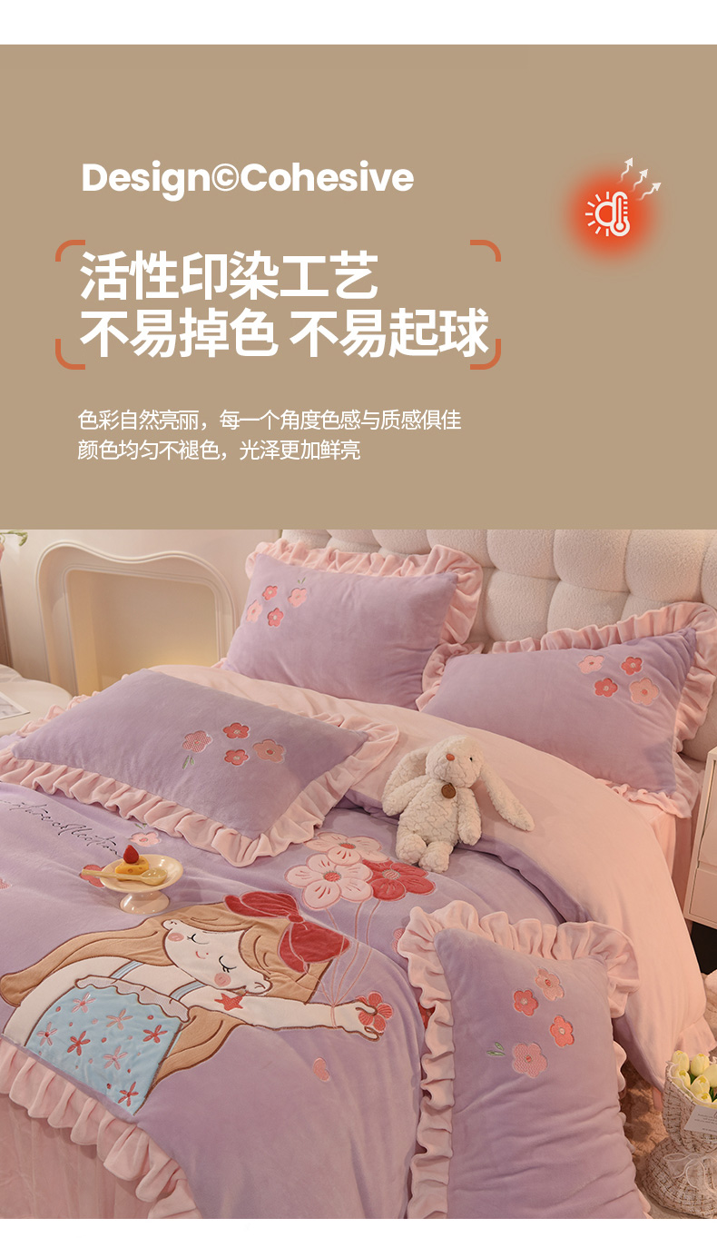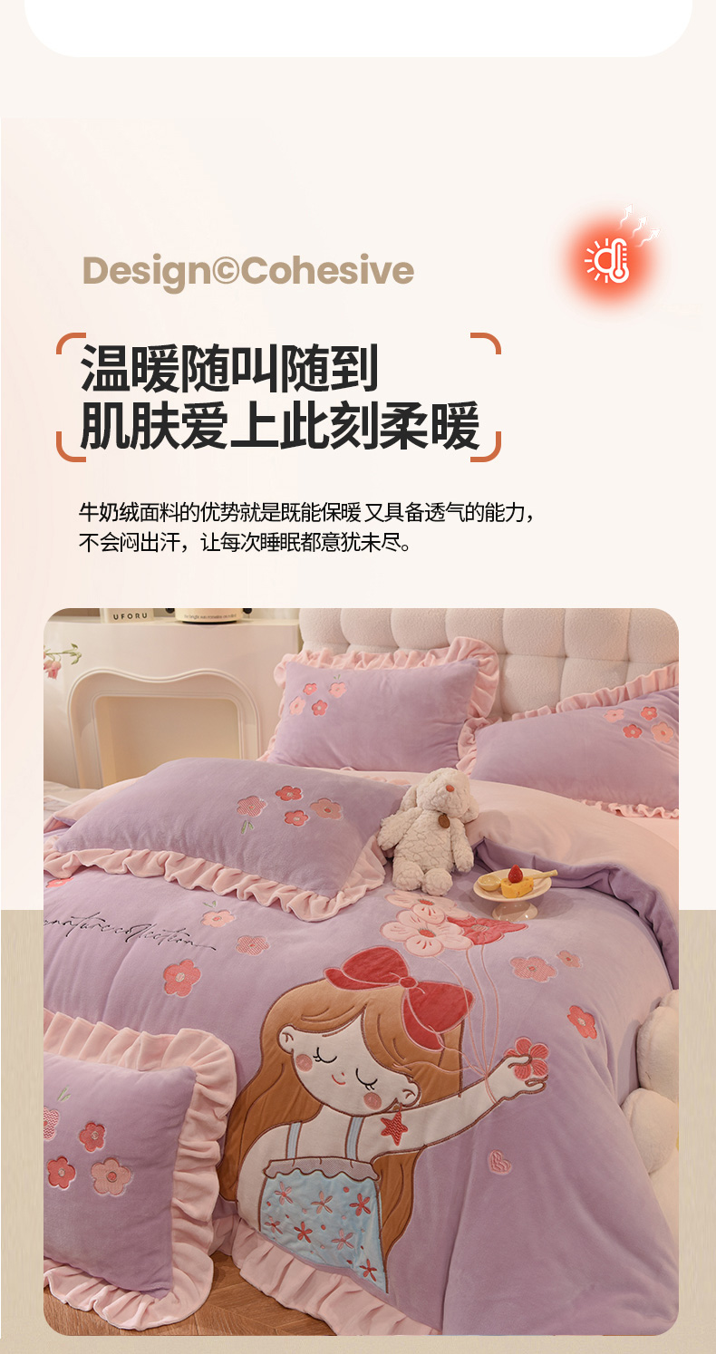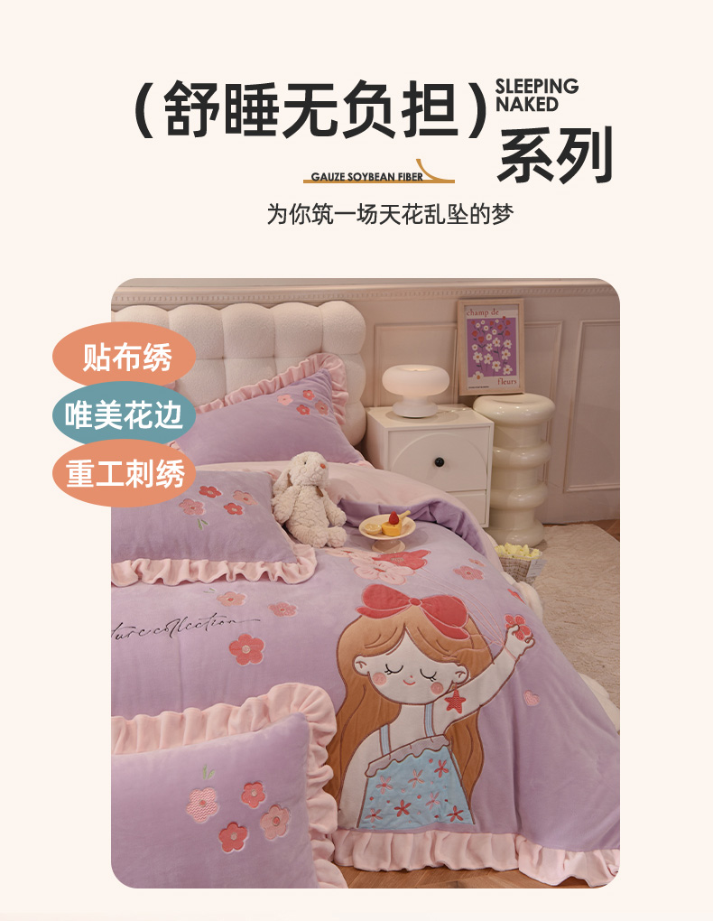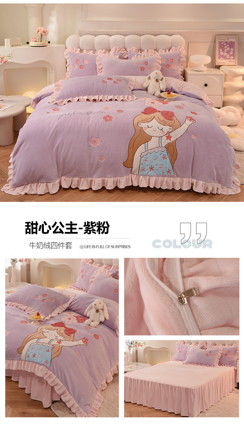 当前位置: 91家纺网 > 商品网购 > 床品套件 > 四件套 > 牛奶绒四件套 > 丝印良品 2023新款高档贴布绣甜心公主牛奶绒四件套 甜心公主-紫粉