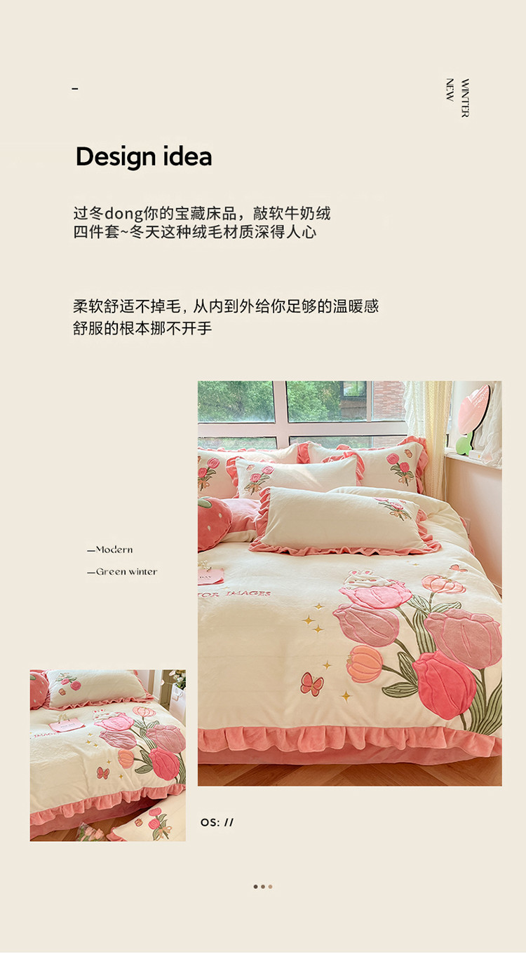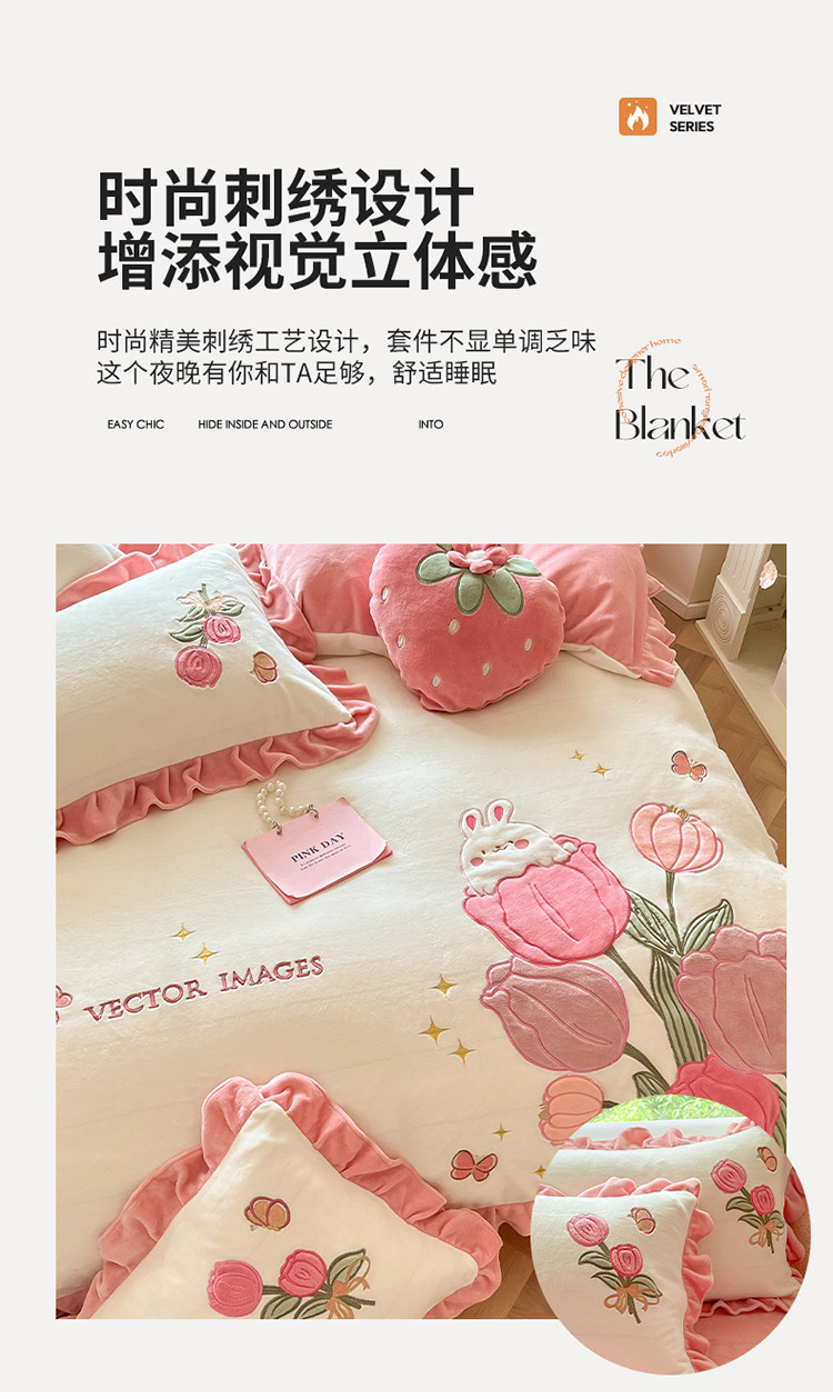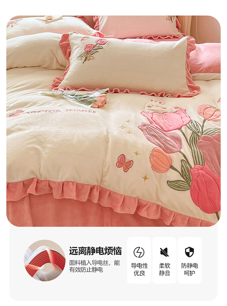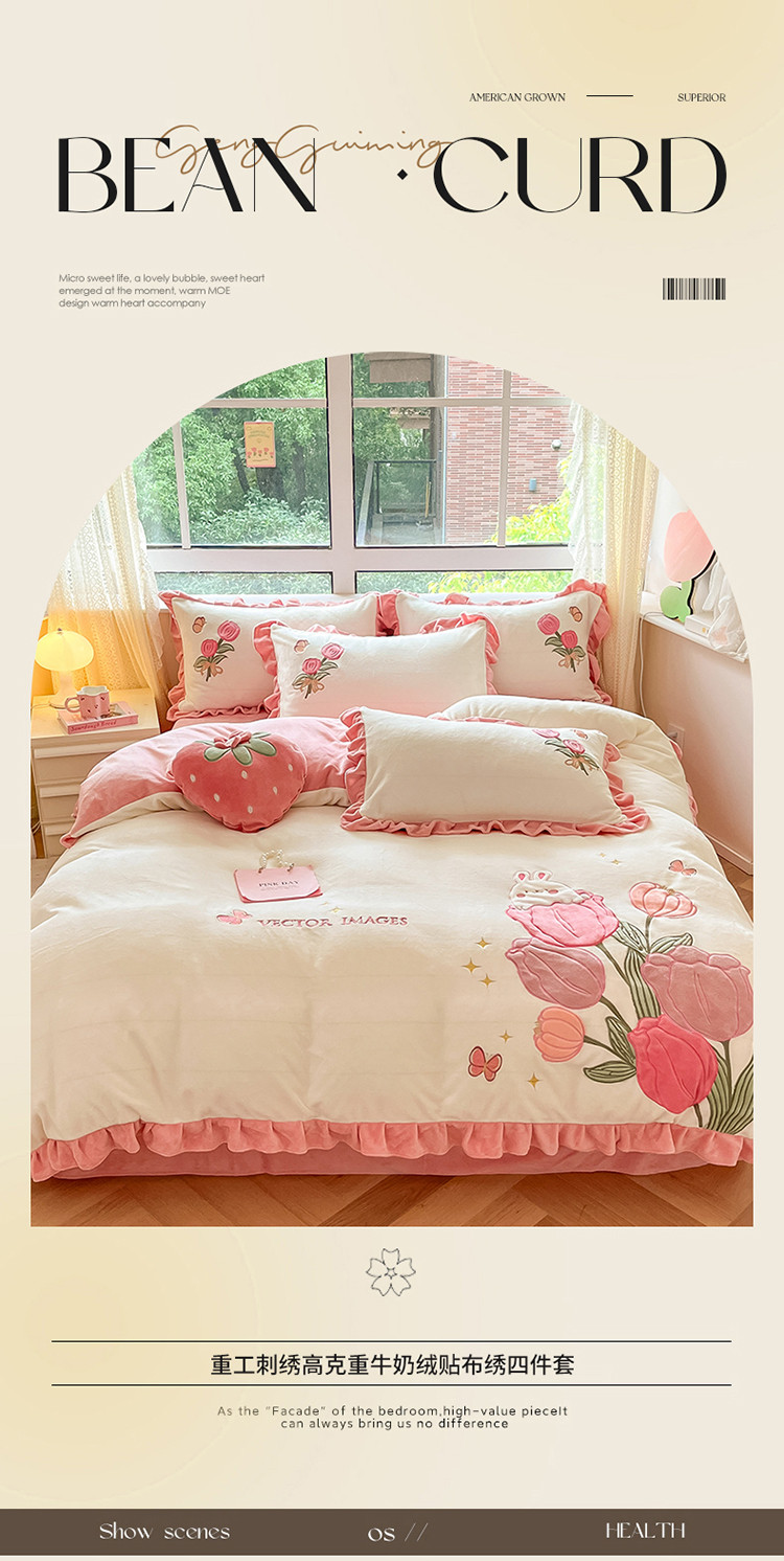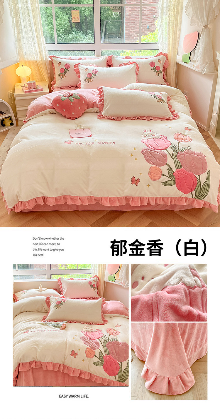 (总)舒梦琪家纺 2024新款加厚牛奶绒夹棉绣床盖四件套12斤左右,粉色,灰色,蓝色,绿色,奶白,紫色