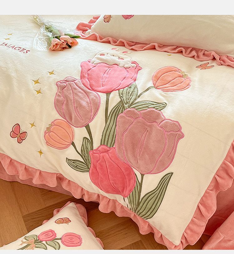 舒梦琪2023专版花型重工刺绣高克重牛奶绒贴布绣四件套 郁金香(白)