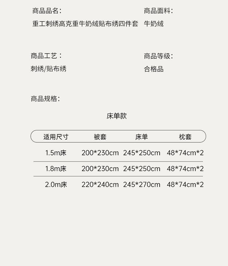 商品名称:舒梦琪2023专版花型重工刺绣高克重牛奶绒贴布绣四件套 郁金香(白)