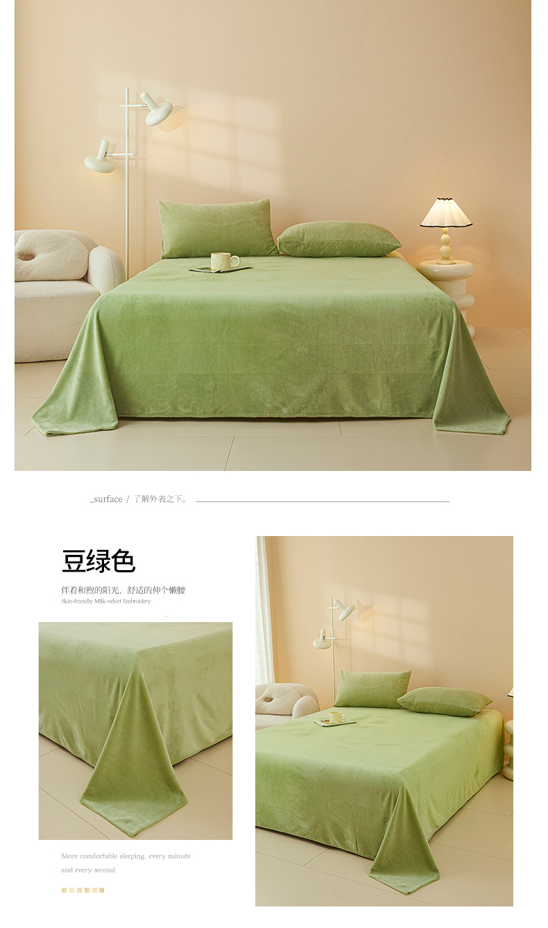 • 91家纺网 家纺一手货源 找家纺 七仙女家纺 2025新款A类230g高克重牛奶绒单品床单 豆绿色