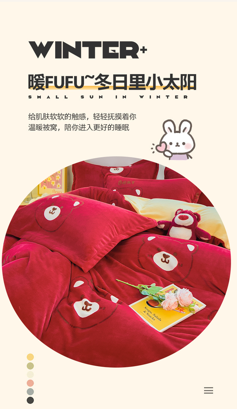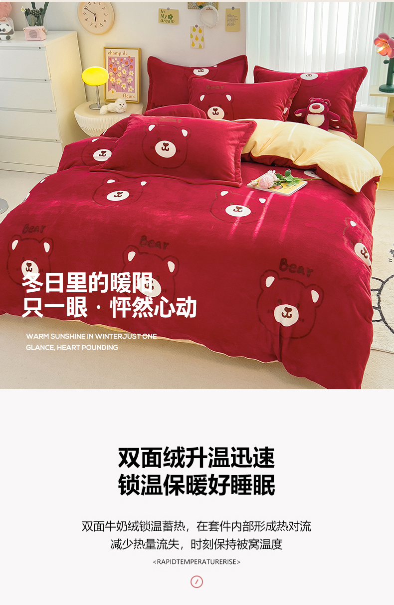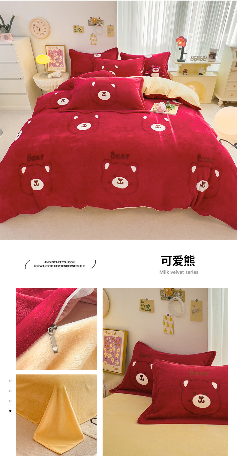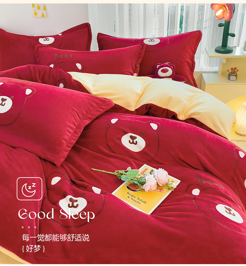 商品名称:全季家居2023新款小清新A类高克重加厚印花牛奶绒四件套 可爱熊