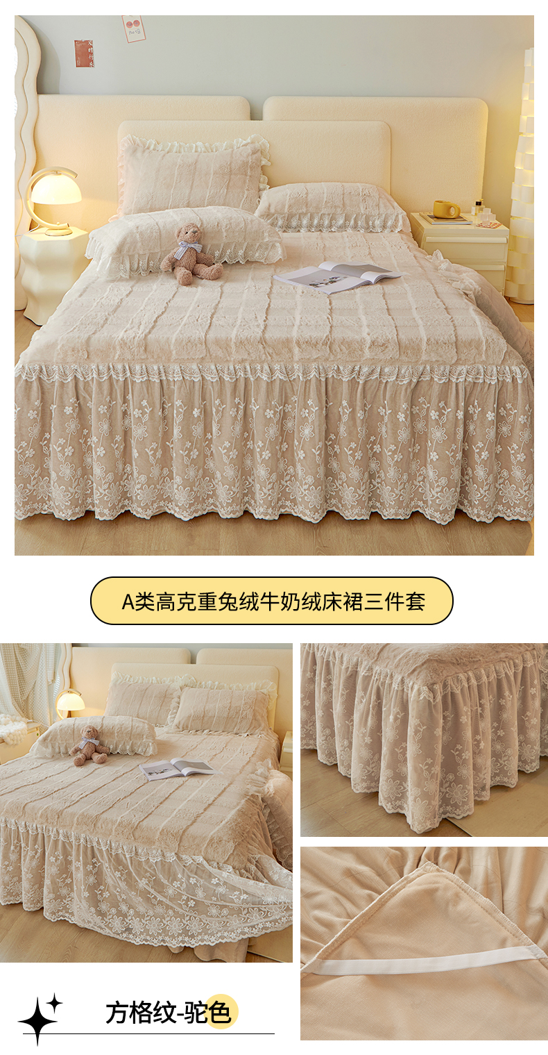 宜凡家纺 2023新款高克重兔绒牛奶绒床裙三件套 方格纹-驼色