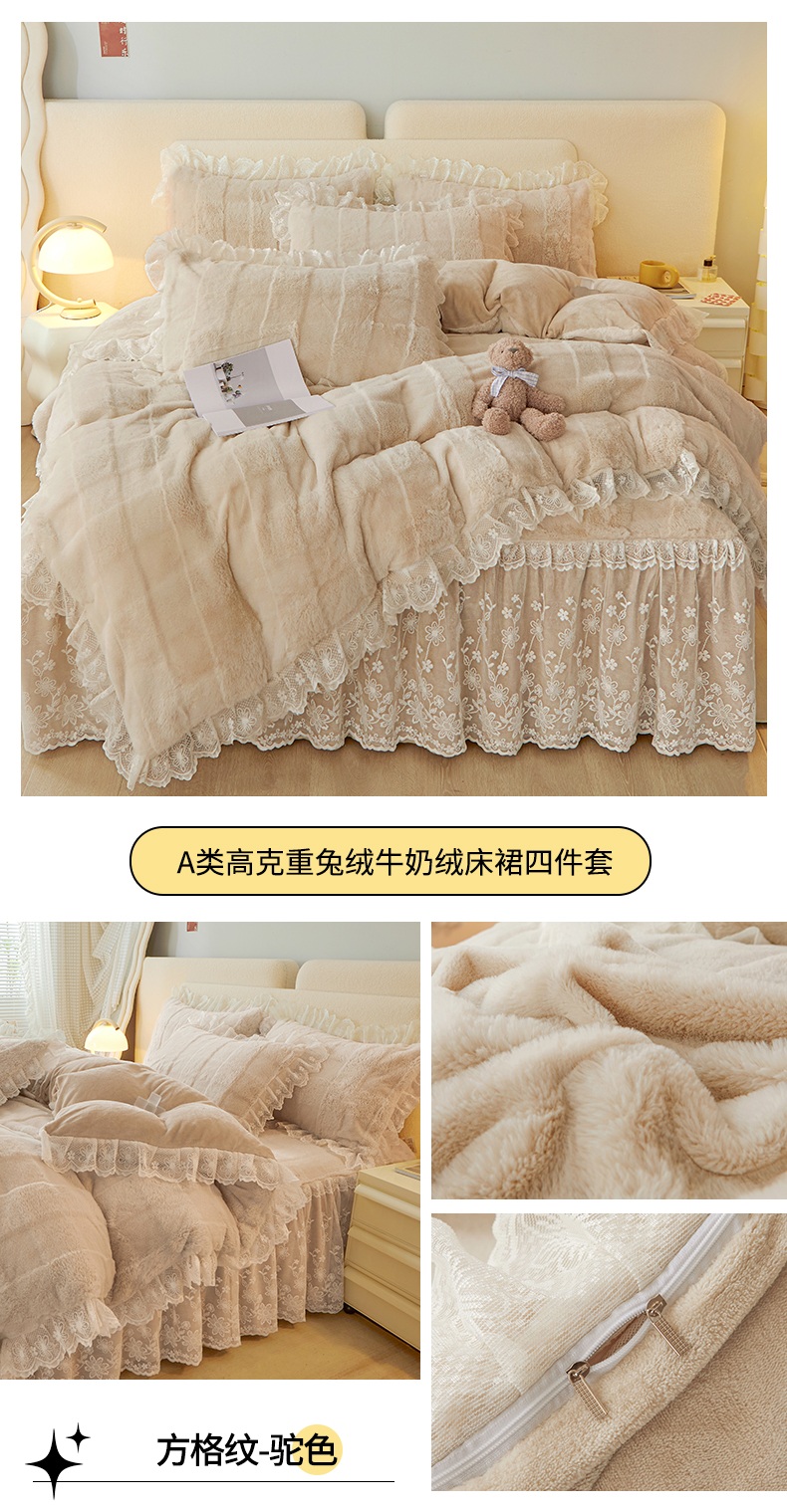 当前位置: 91家纺网 > 商品网购 > 床品套件 > 四件套 > 兔毛绒四件套 > 宜凡家纺 2023新款高克重兔绒牛奶绒床裙四件套 方格纹-驼色