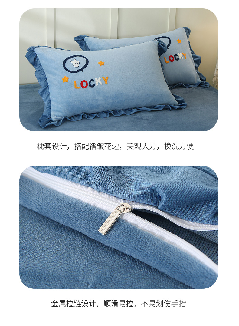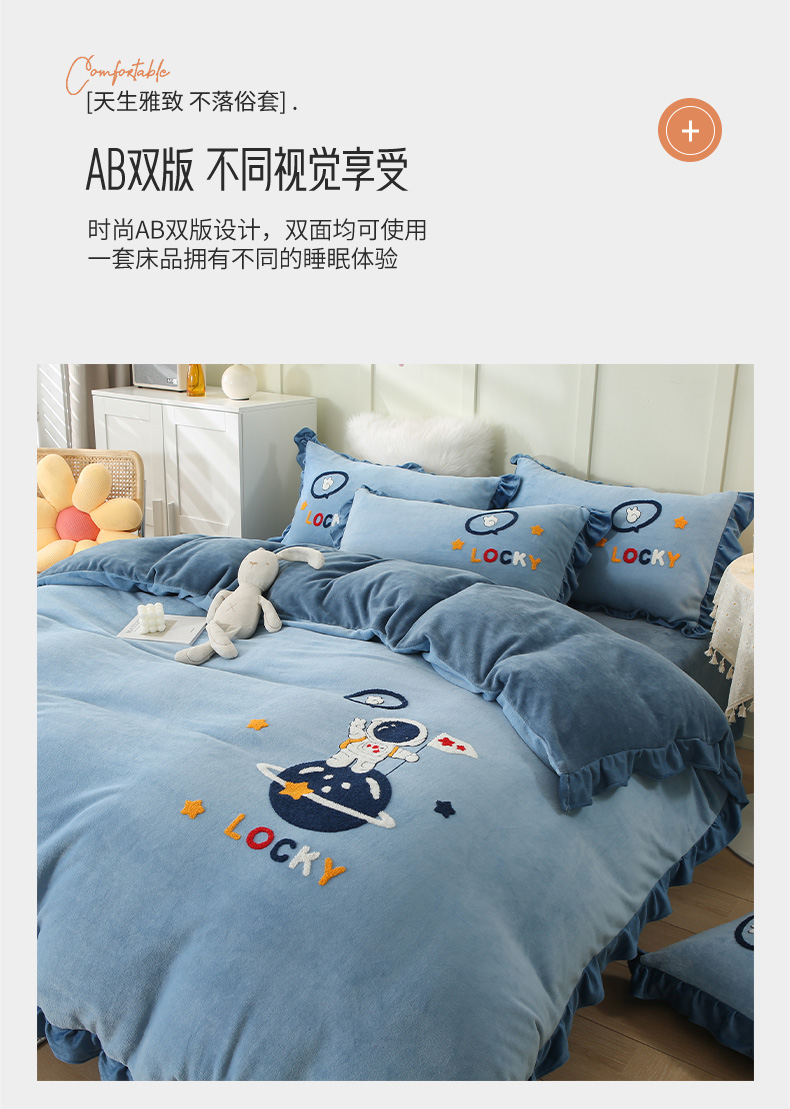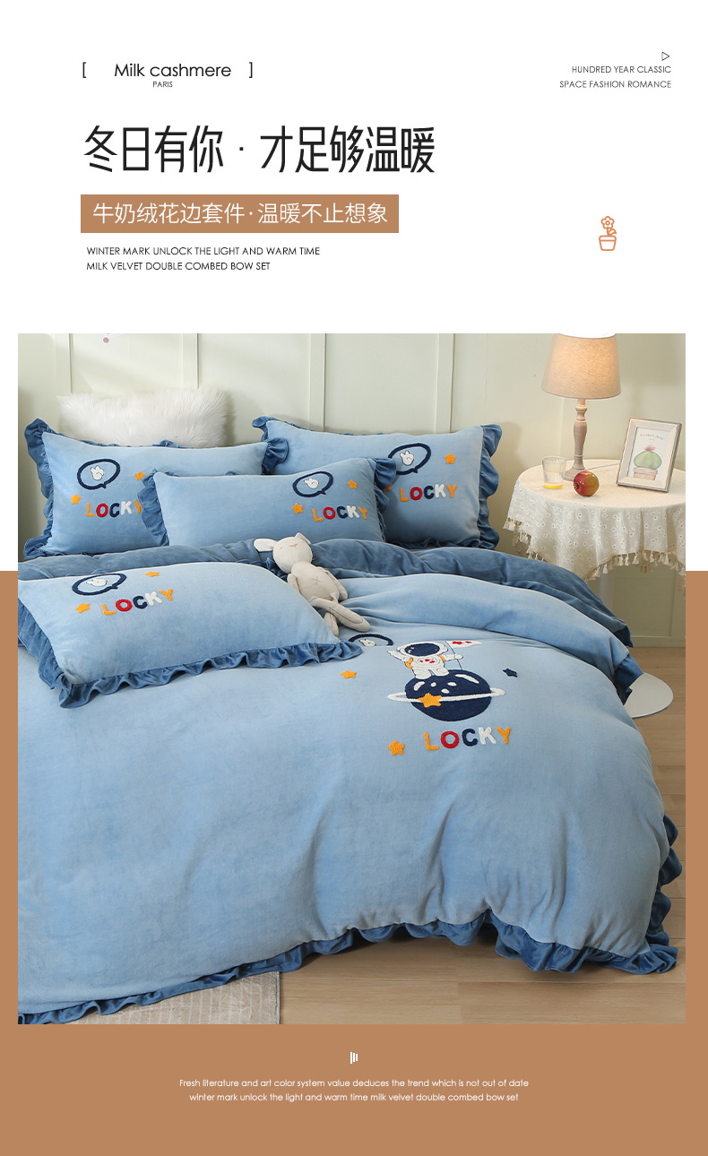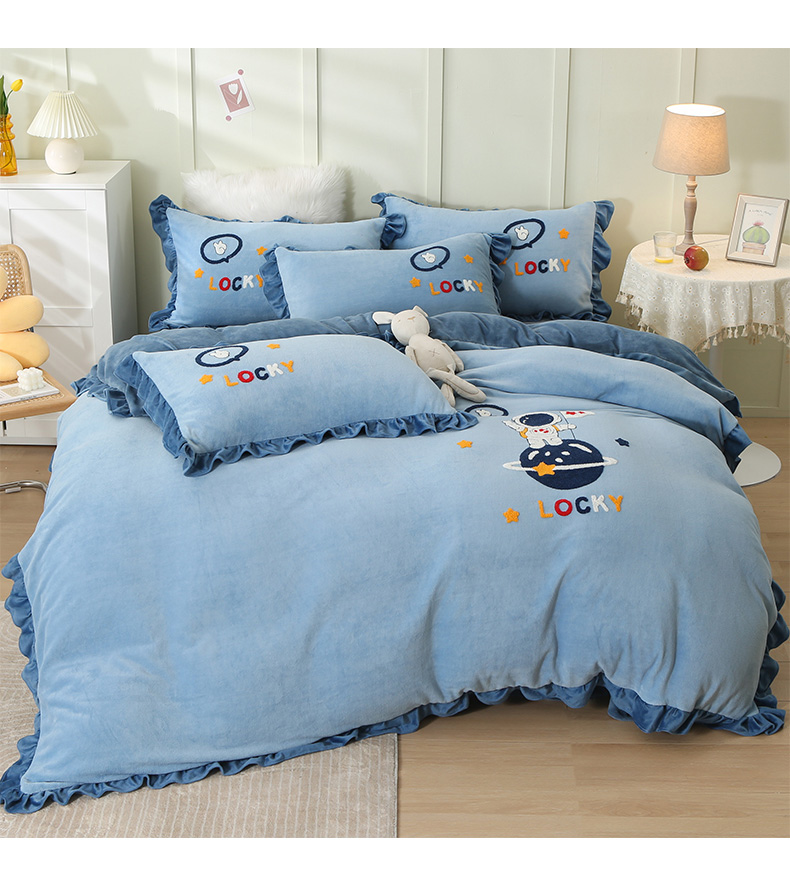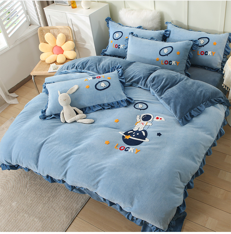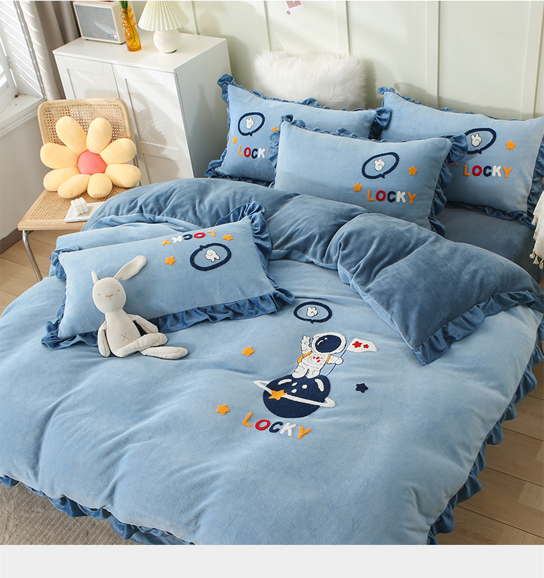 沐辰 2023新款韩版绣花加厚牛奶绒四套件 太空人-蓝
