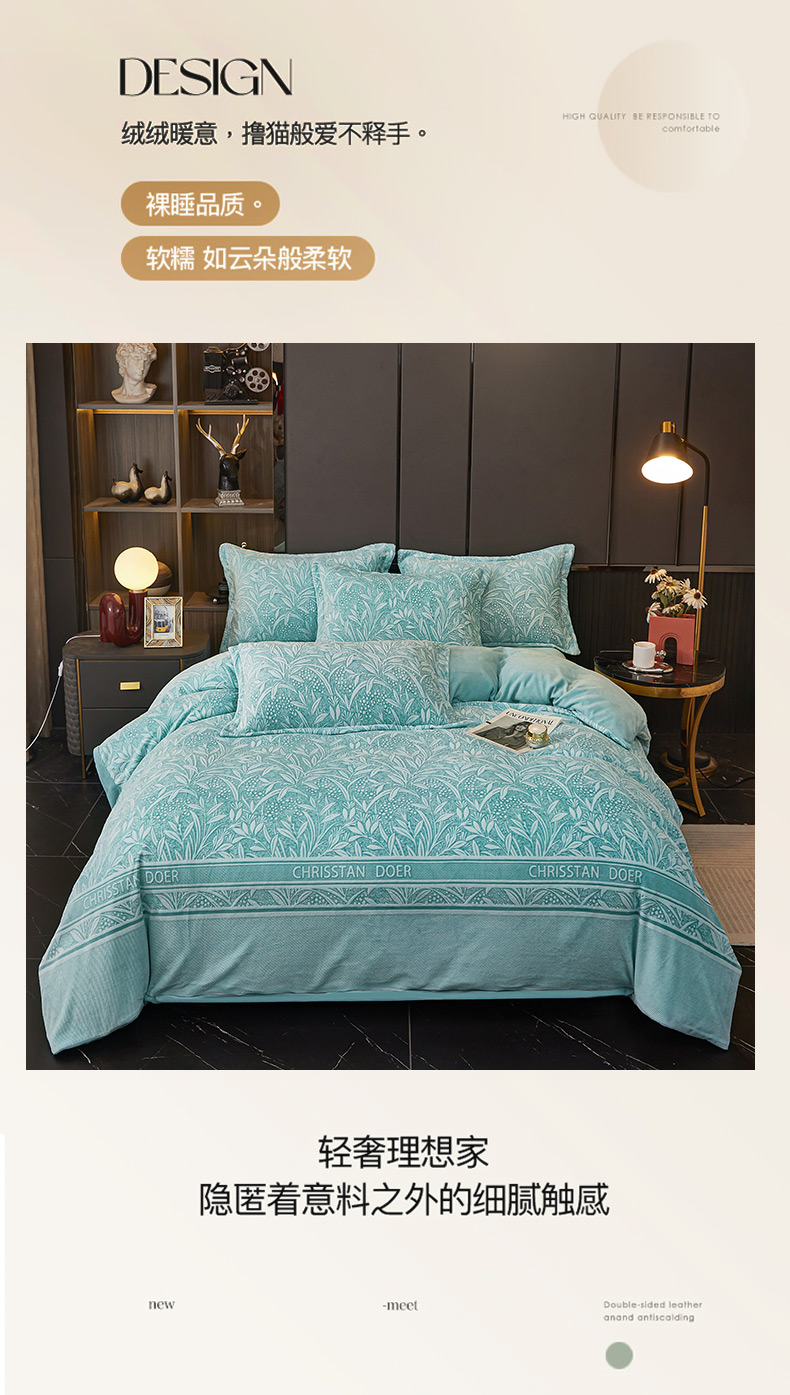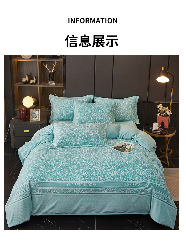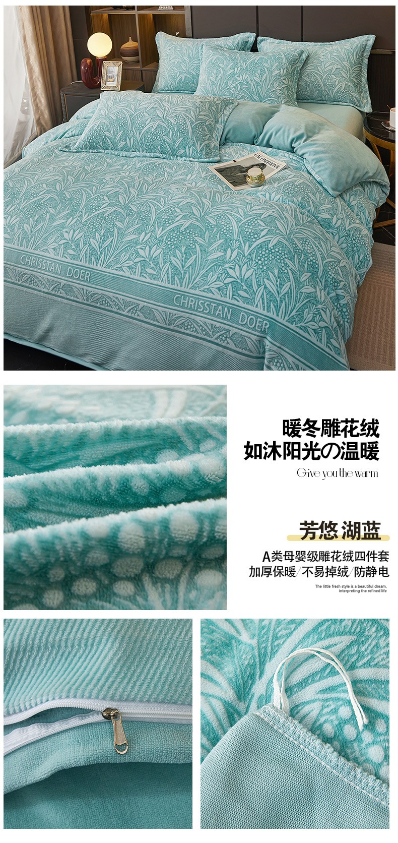 商品名称:金纱玉纺 2023年新款母婴级雕花绒四件套 芳悠-湖蓝