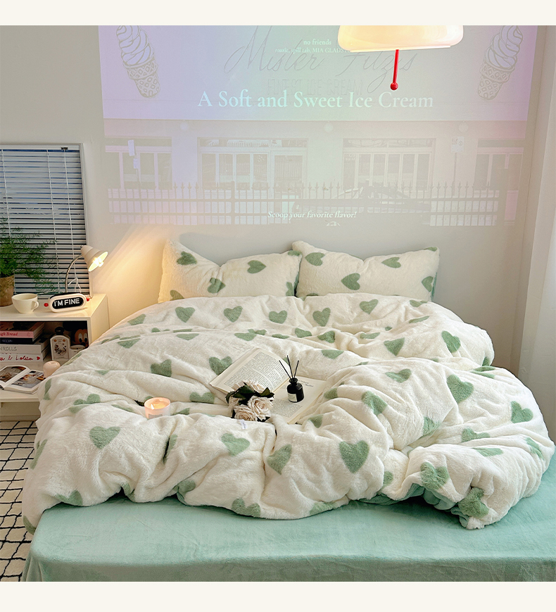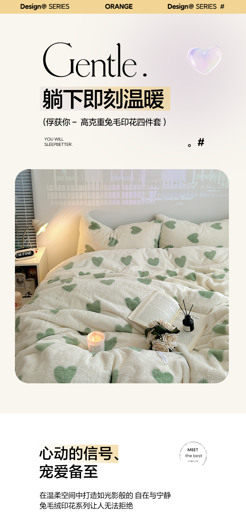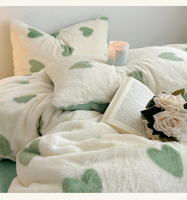 雅居纺家纺 2023新款兔毛印花牛奶绒四件套 爱心-绿