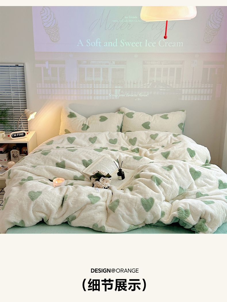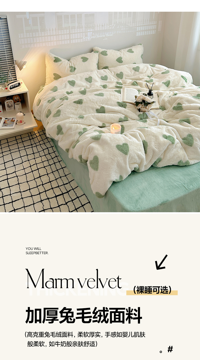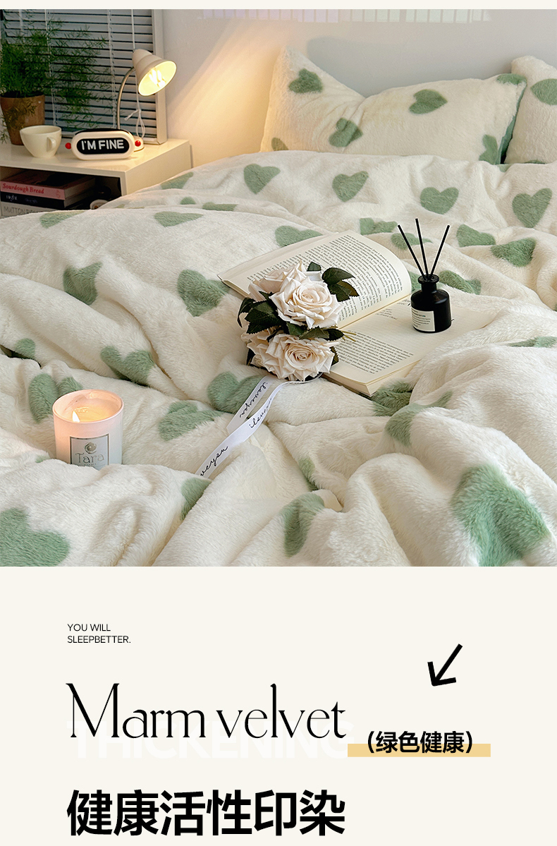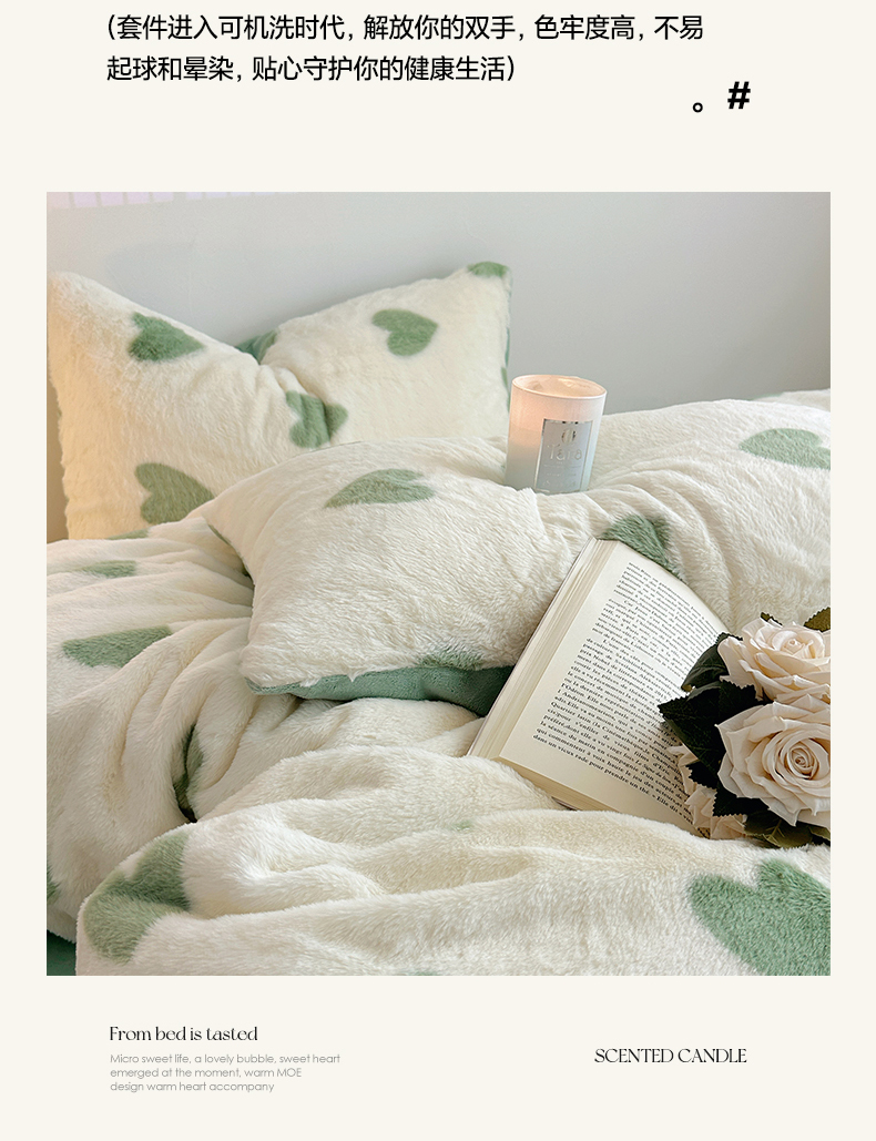 商品名称:雅居纺家纺 2023新款兔毛印花牛奶绒四件套 爱心-绿