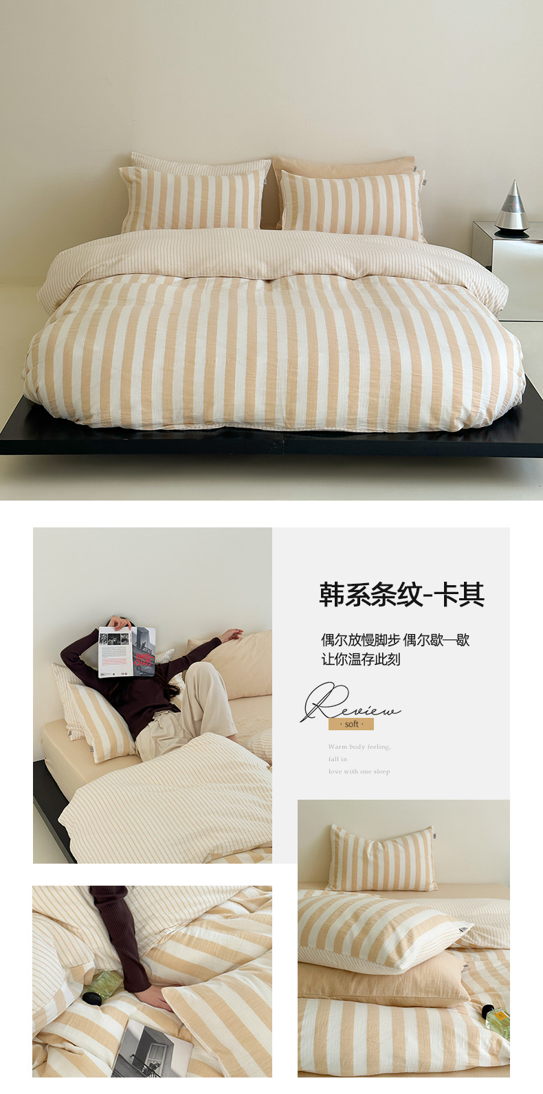 商品名称:玛奇朵 2023新款色织双层皱纱-韩系条纹四件套 韩系条纹-卡其